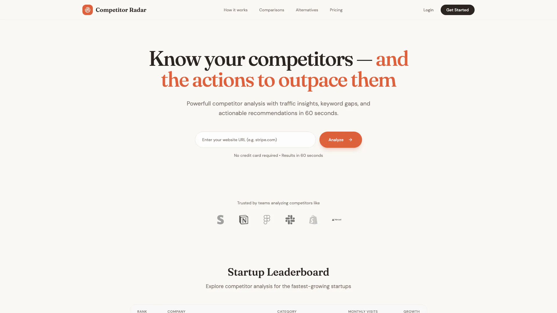 Knowyourcompetitor is an AI-powered competitor analysis tool designed to provide users with rapid insights into their competitive landscape. With the ability to analyze competitors in just 60 seconds, it offers essential data such as traffic insights, keyword overlap, pricing comparisons, and comprehensive SWOT analyses. This tool empowers businesses to understand their competitors better and devise strategies to outpace them in the market.