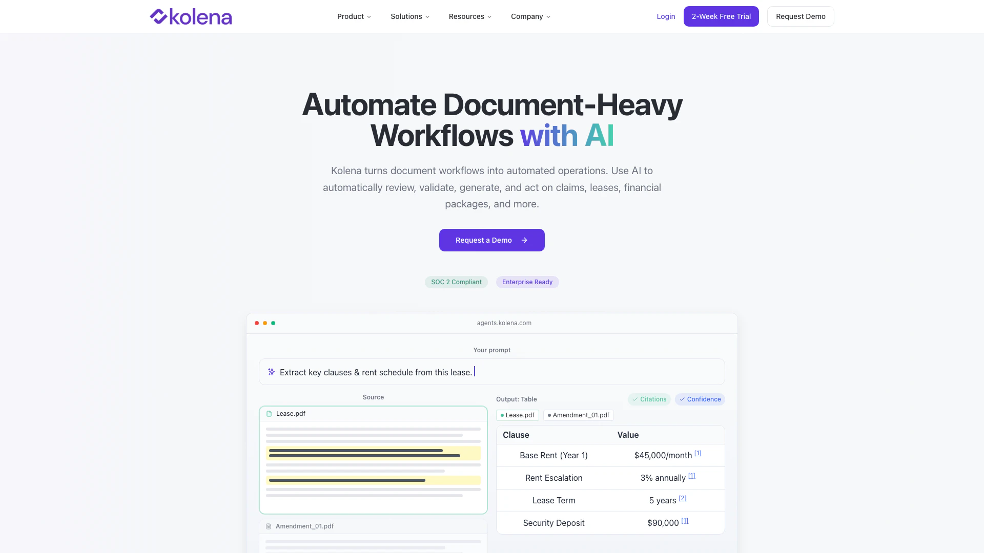 Kolena is an advanced AI-powered[1] platform designed to automate document-heavy workflows across various industries, including real estate, finance, insurance, and banking. It streamlines processes such as lease abstraction[3], rent rolls, pay applications, and compliance checks by leveraging artificial intelligence to review, validate, and generate documents efficiently. With a focus on transparency and reliability, Kolena transforms traditional document workflows[4] into automated operations, significantly reducing processing times and enhancing accuracy.