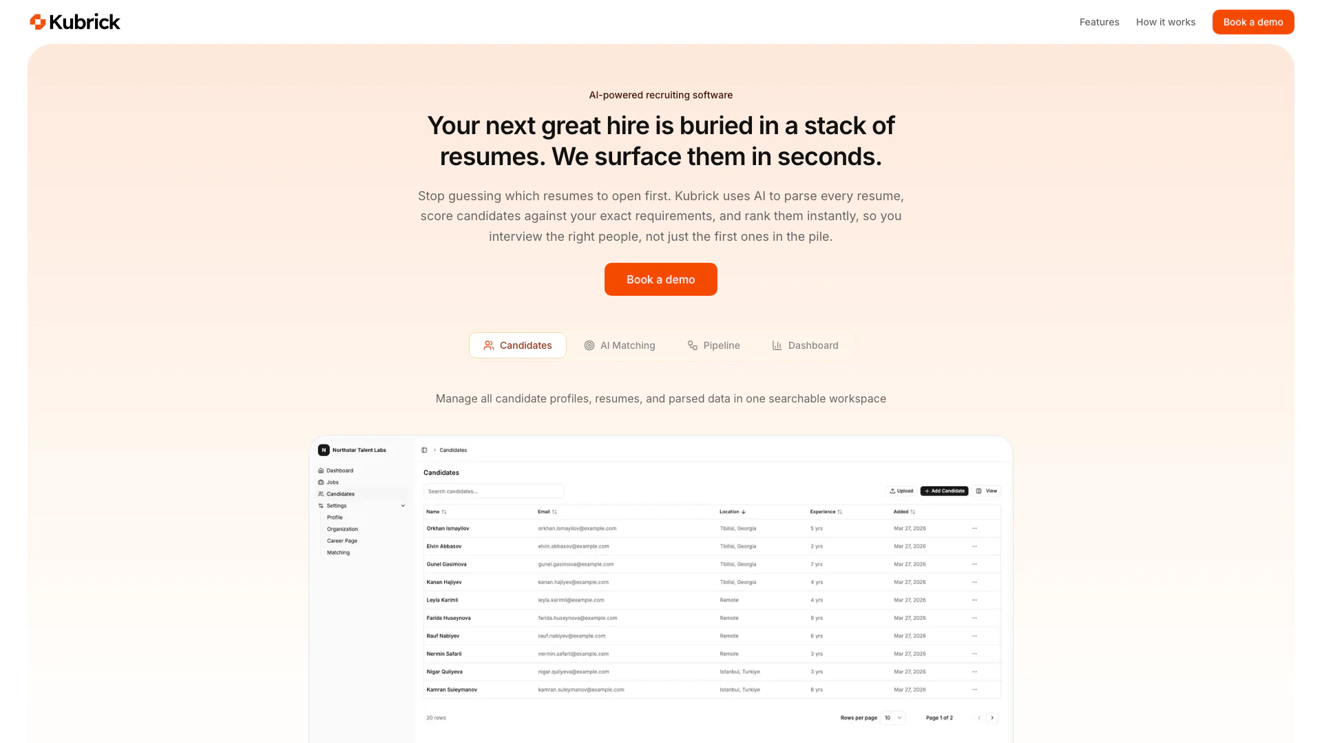 Kubrick is an AI-powered recruiting software that parses resumes, scores candidates against your job requirements, and ranks them instantly, allowing for transparent and explainable hiring decisions.