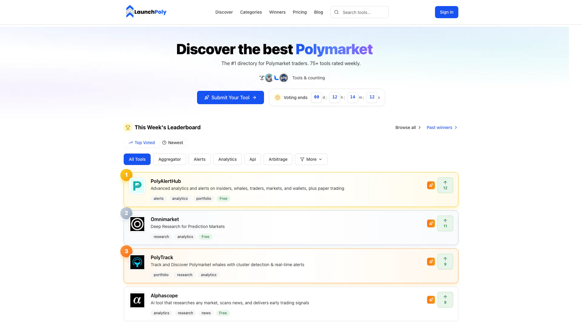 LaunchPoly helps Polymarket traders discover the best tools to trade smarter. Find analytics dashboards, trading bots, portfolio trackers, alerts, and more - all rated by the community with weekly top 3 winners.