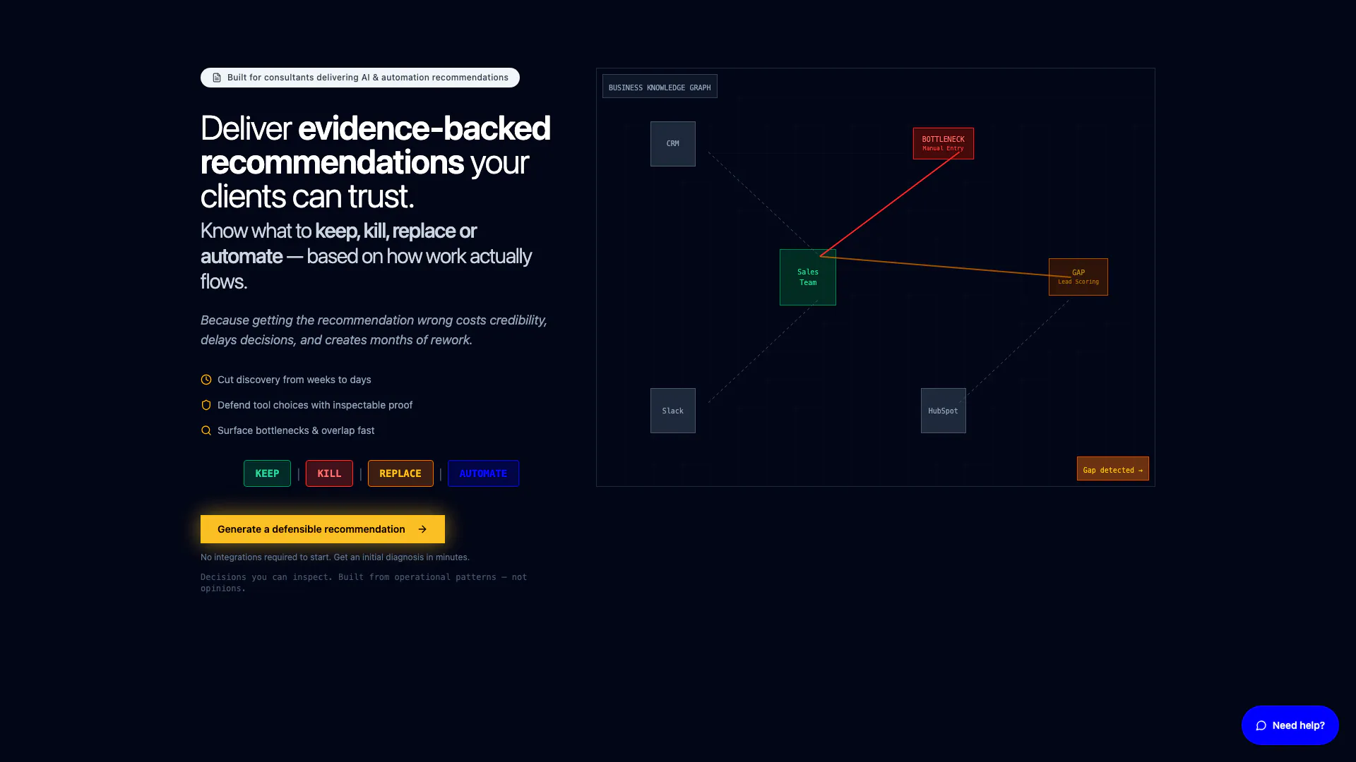 - Clear Decision Making: Receive verdicts on app usage (KEEP, KILL, REPLACE) and workflow decisions (AUTOMATE, STREAMLINE, KEEP) backed by evidence.
