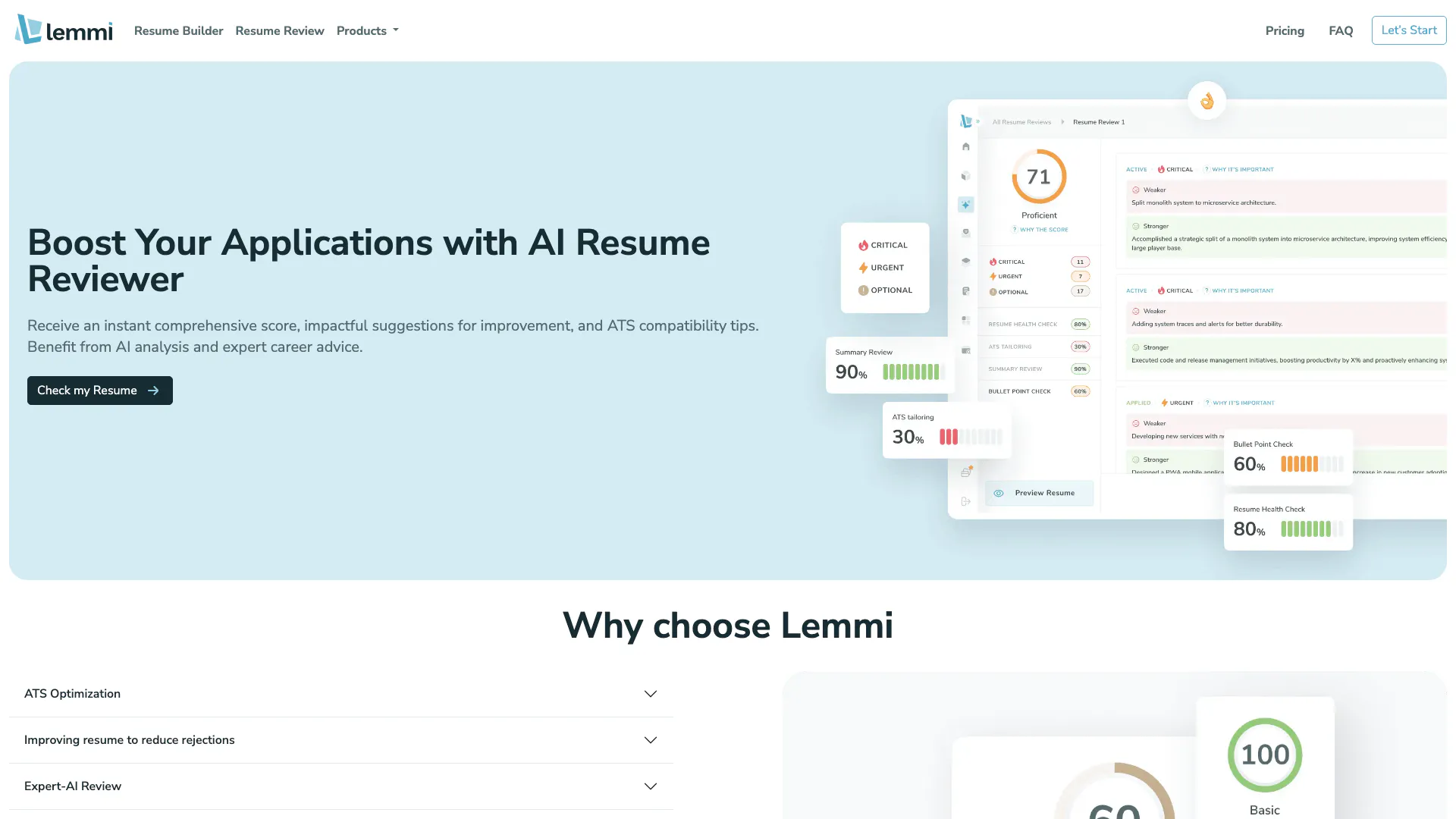 - ATS Optimization: Lemmi helps users increase their ATS score by identifying and incorporating the right keywords, which boosts their chances of being selected by applicant tracking systems.