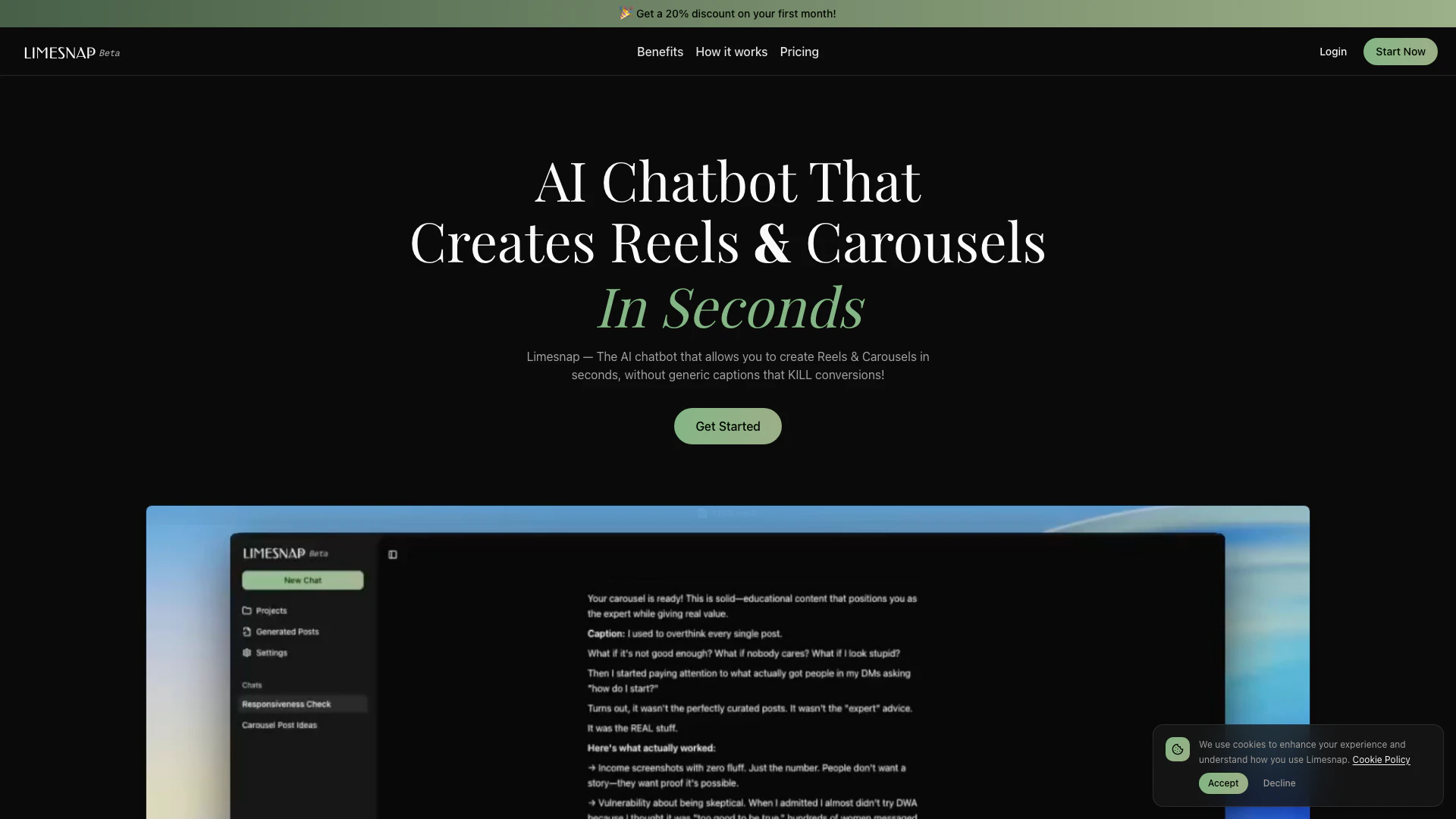- AI-Powered Content Creation: Limesnap utilizes AI trained specifically for marketing, enabling users to create engaging Instagram Reels and Carousels quickly without design skills.