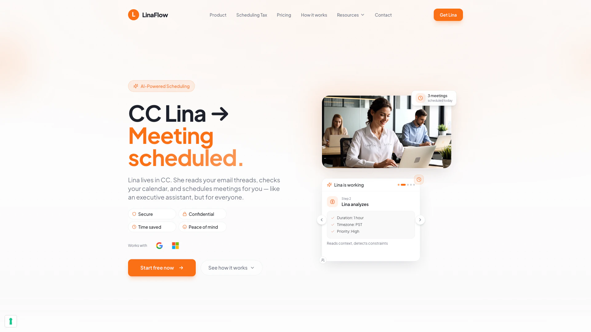Get 10 free meetings scheduled every month. Use Lina by CC'ing lina@linaflow.eu. Privacy and cybersecurity-first architecture. Upgrade anytime.