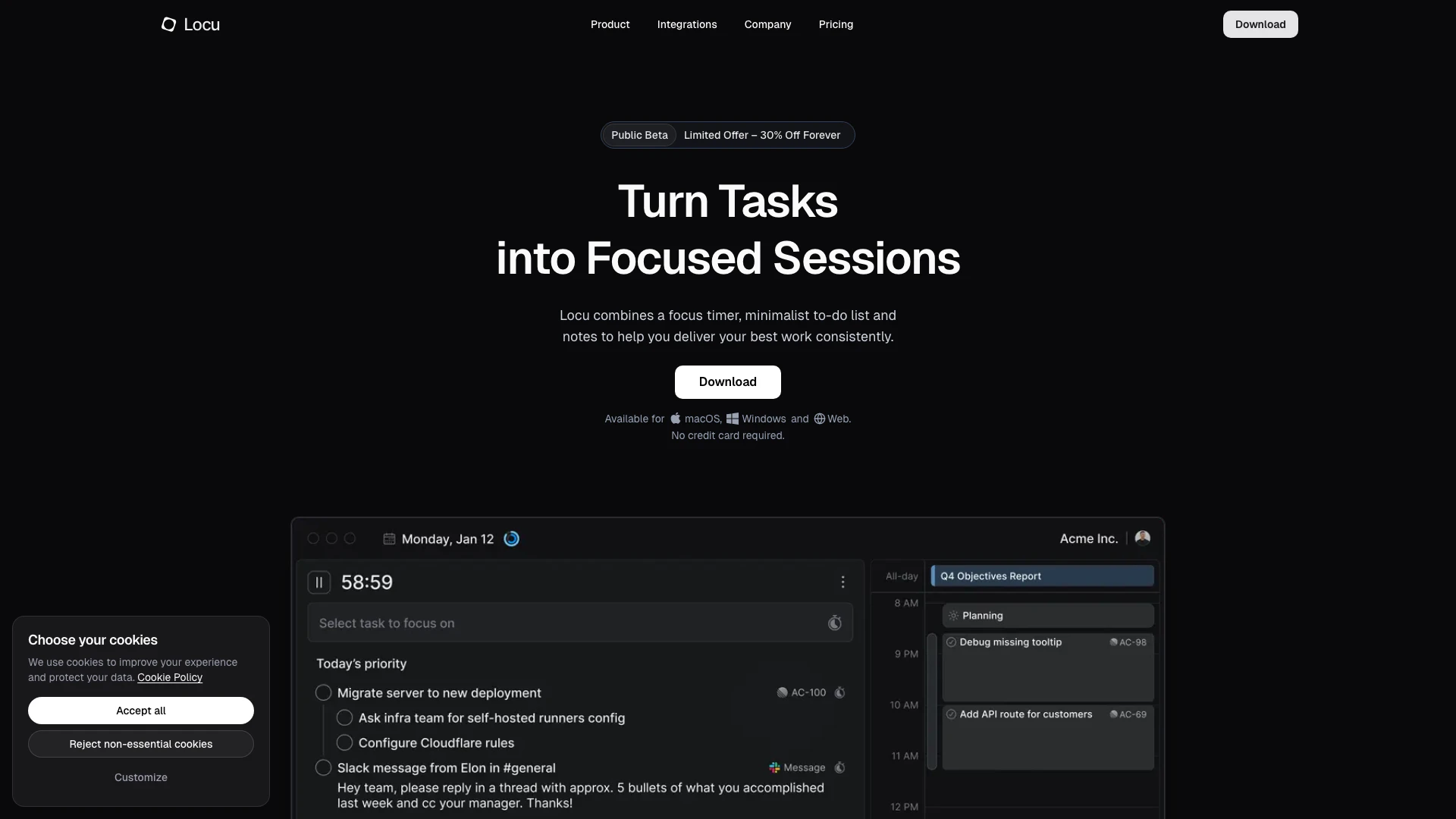 Locu is a daily execution system[1] designed specifically for developers, aimed at enhancing productivity through structured focus sessions[2]. By allowing users to plan priorities, concentrate on single tasks for 90-minute intervals, and track their time effectively, Locu integrates seamlessly with popular project management tools like Jira and Linear. This tool provides a minimalist to-do list, a focus timer, and note-taking capabilities, ensuring that users can consistently deliver high-quality work while minimizing distractions.