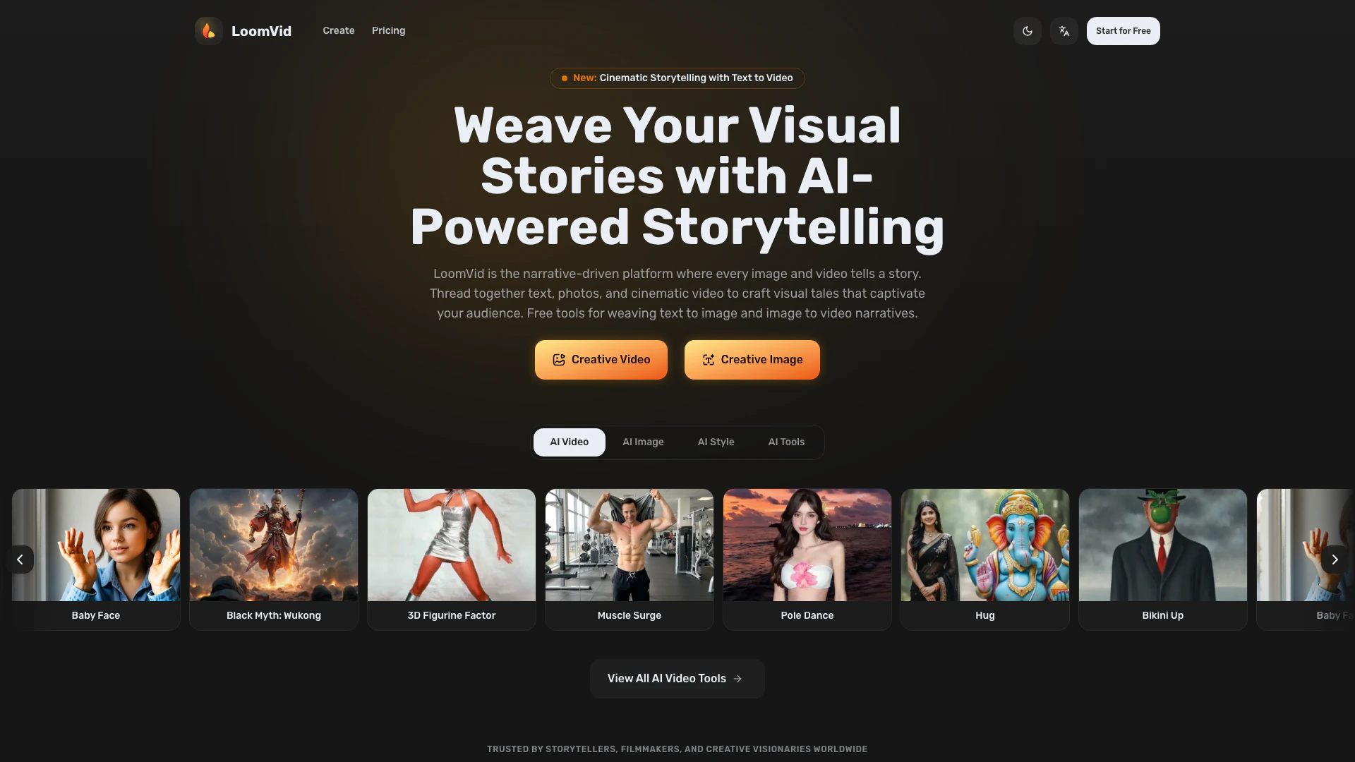 LoomVid is a narrative-driven platform for weaving stunning visual stories through images and cinematic videos. With LoomVid, you get professional storytelling tools including video generation, image enhancement, and creative filters designed to bring your narratives to life.