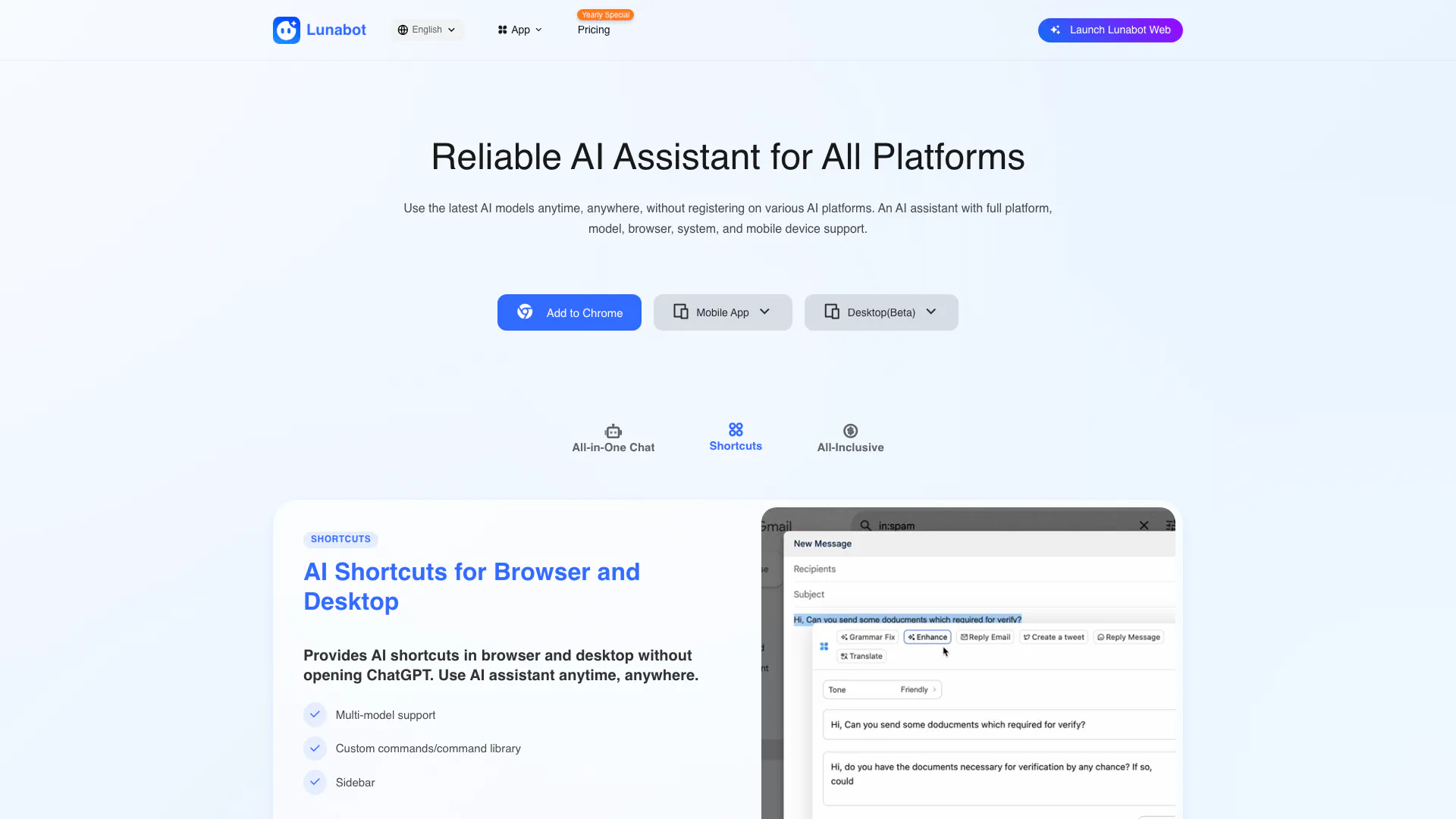 - Comprehensive Platform Support: Lunabot supports all major platforms including mobile, desktop, and web, allowing users to access the AI assistant anytime and anywhere.