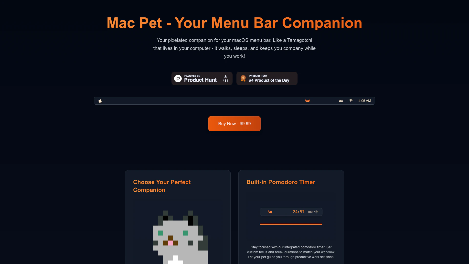 Mac Pet is a delightful menu bar companion[1] designed for macOS that enhances productivity[2] while providing a playful experience. This pixelated pet mimics the behavior of a Tamagotchi, walking while you work and napping during breaks. It features a built-in Pomodoro timer[3] to help you manage your work sessions effectively and tracks your activity streaks with visually appealing graphs. With options to choose from various cats and dogs, Mac Pet adds a personal touch to your workspace, making work both fun and productive.