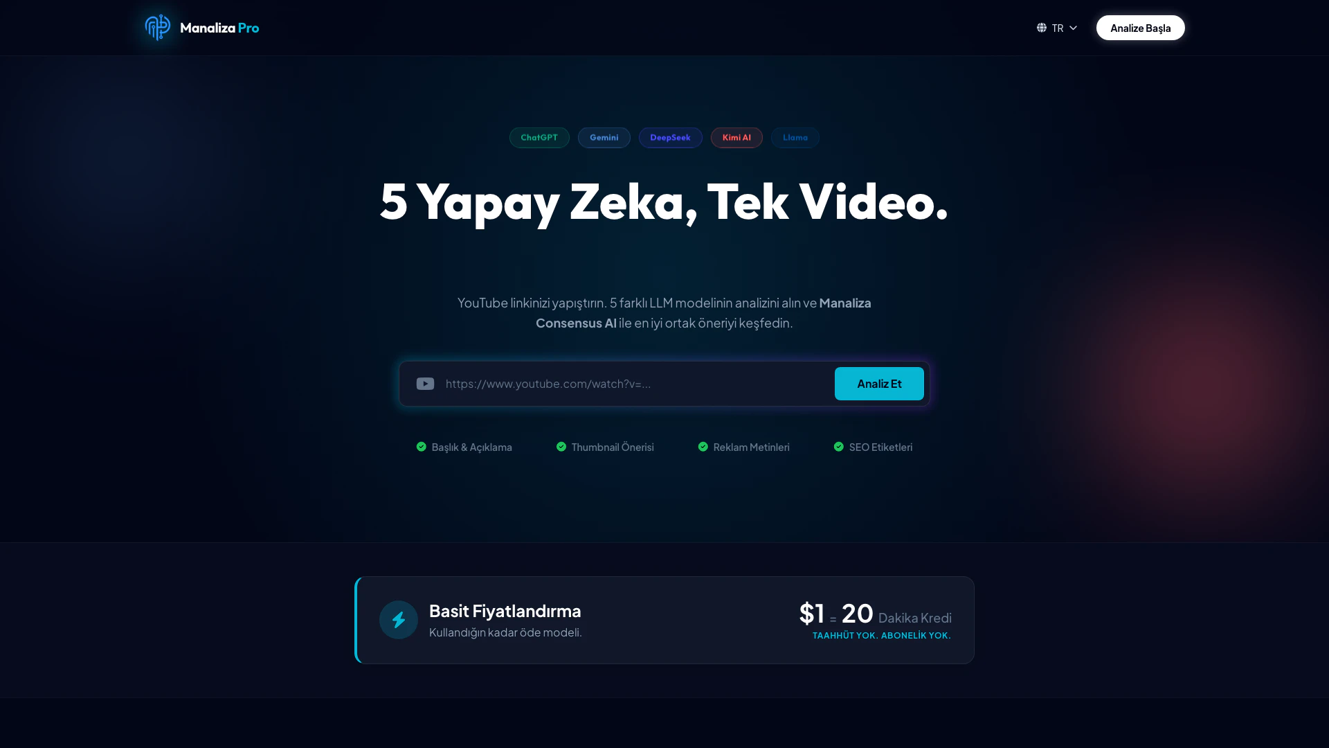 Manaliza is an advanced AI tool designed to analyze YouTube videos using five different language models: Gemini, ChatGPT, DeepSeek, Kimi, and Llama. It provides comprehensive insights by extracting video transcripts and visual elements, allowing users to obtain the best common recommendations through its unique consensus AI feature. This tool aims to enhance video optimization through collective intelligence, minimizing errors and maximizing effectiveness.
