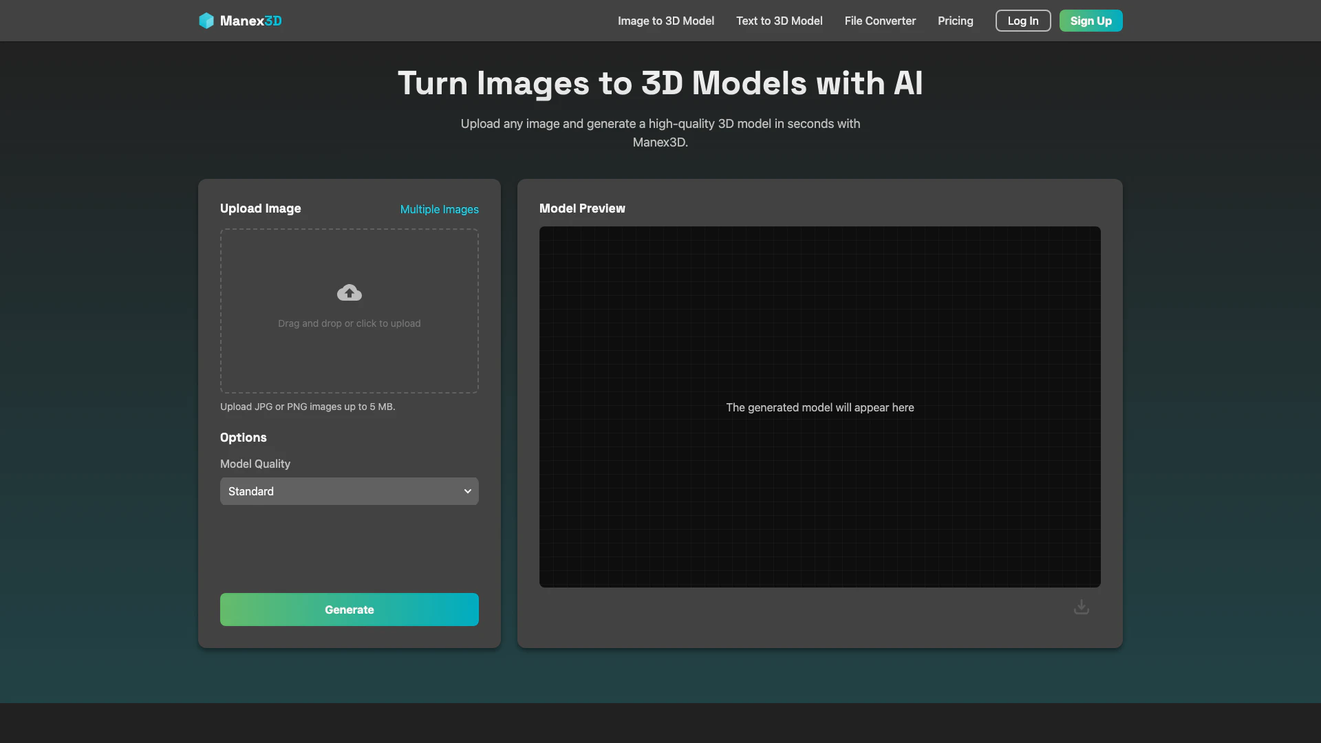 Manex3D offers a variety of powerful features that enhance the user experience and output quality: - High-Quality Model Generation: Quickly convert images into accurate 3D models. - Customizable Settings: Adjust model quality and other parameters to fit your specific needs. - Multiple Export Formats: Save your models in formats like OBJ, GLB, and STL for compatibility with various software. - Real-time Preview: Interact with your 3D model instantly to ensure it meets your expectations.