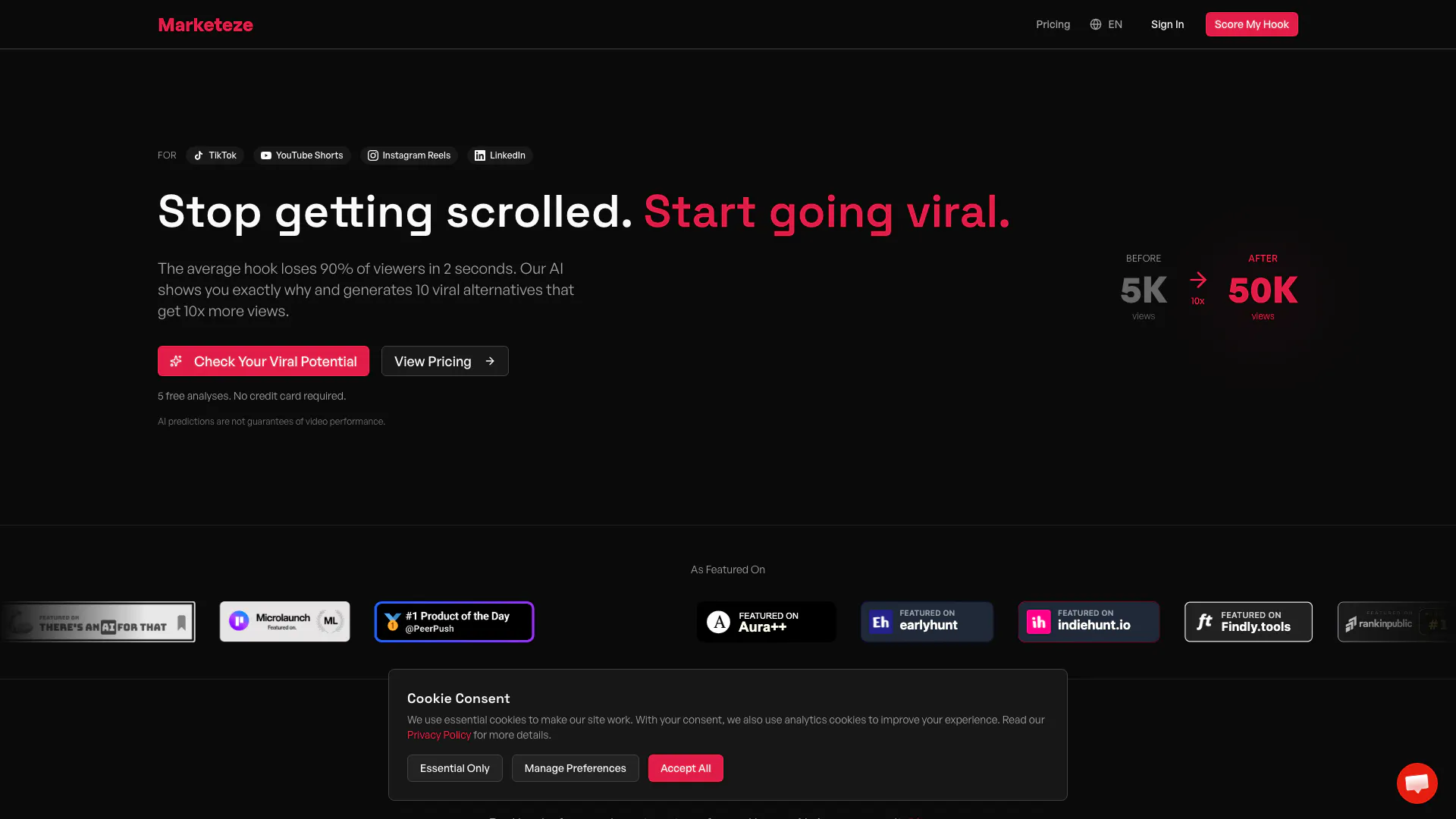 Marketezeai is an AI-powered video hook analyzer designed to help content creators enhance their video performance on platforms like TikTok, Instagram Reels, and YouTube Shorts. By scoring your video hooks on a scale of 1 to 100, it provides instant feedback and generates up to 10 viral alternatives that can significantly increase viewer engagement. The tool is free to try, making it accessible for creators looking to improve their content's reach and effectiveness.