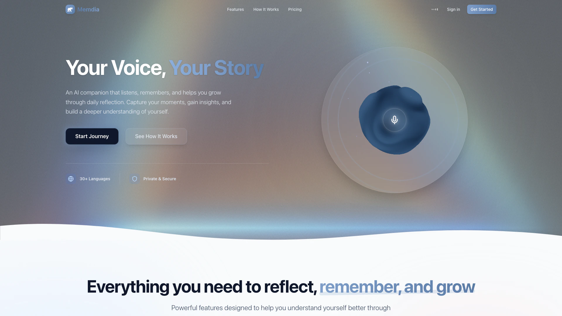 Memdia is an innovative AI companion[1] designed to assist users in their journey of self-reflection and personal growth. It provides a platform where individuals can capture their daily experiences through voice journaling[2], gain insights into their emotional states, and develop a deeper understanding of themselves. With features like daily voice sessions, therapeutic conversations[4], and an insights dashboard, Memdia empowers users to reflect on their lives, track their emotional journeys, and foster personal growth.