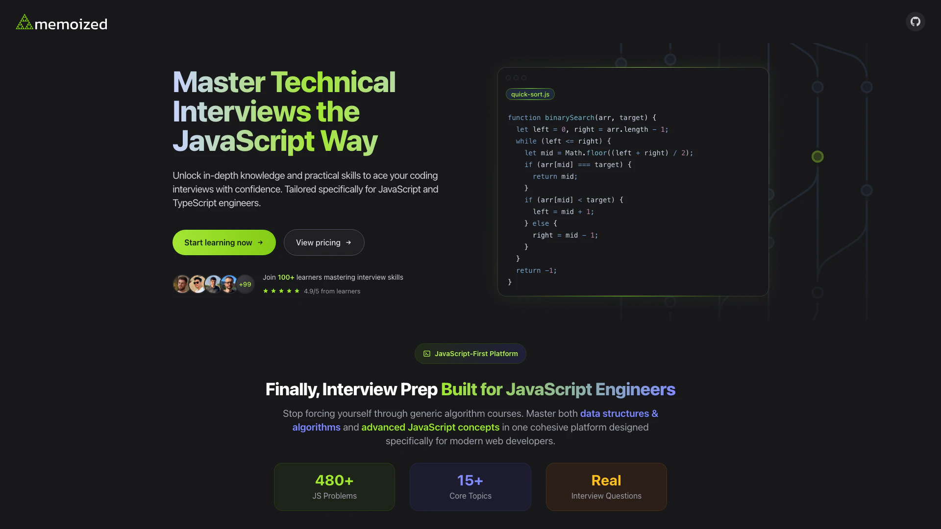 - Comprehensive JavaScript Focus: Memoized offers a specialized curriculum designed for JavaScript and TypeScript engineers, covering both algorithms and advanced JS concepts.