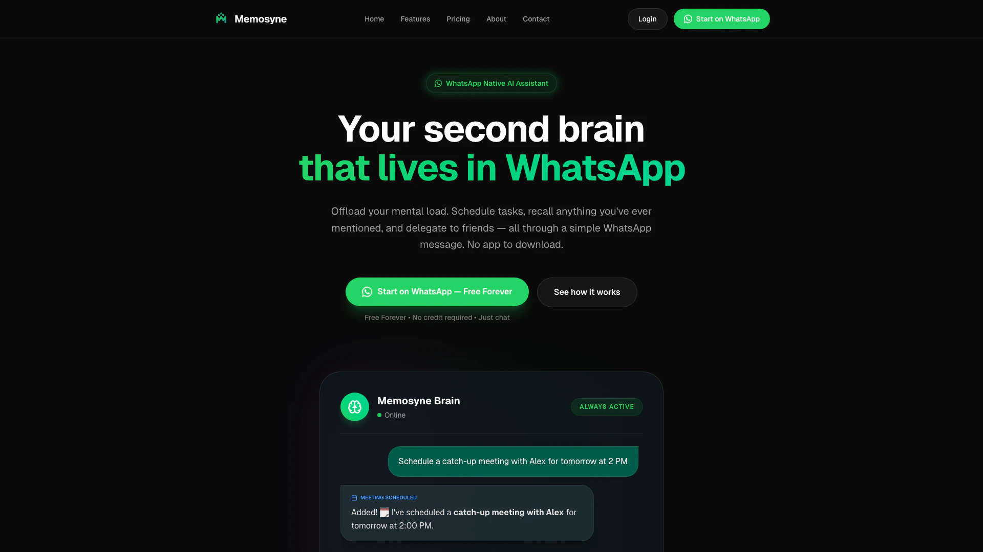 Memosyne is an AI assistant that lives in WhatsApp. You message it naturally, like texting a friend, and it helps you schedule tasks, manage lists, recall information, and more. No app download required.