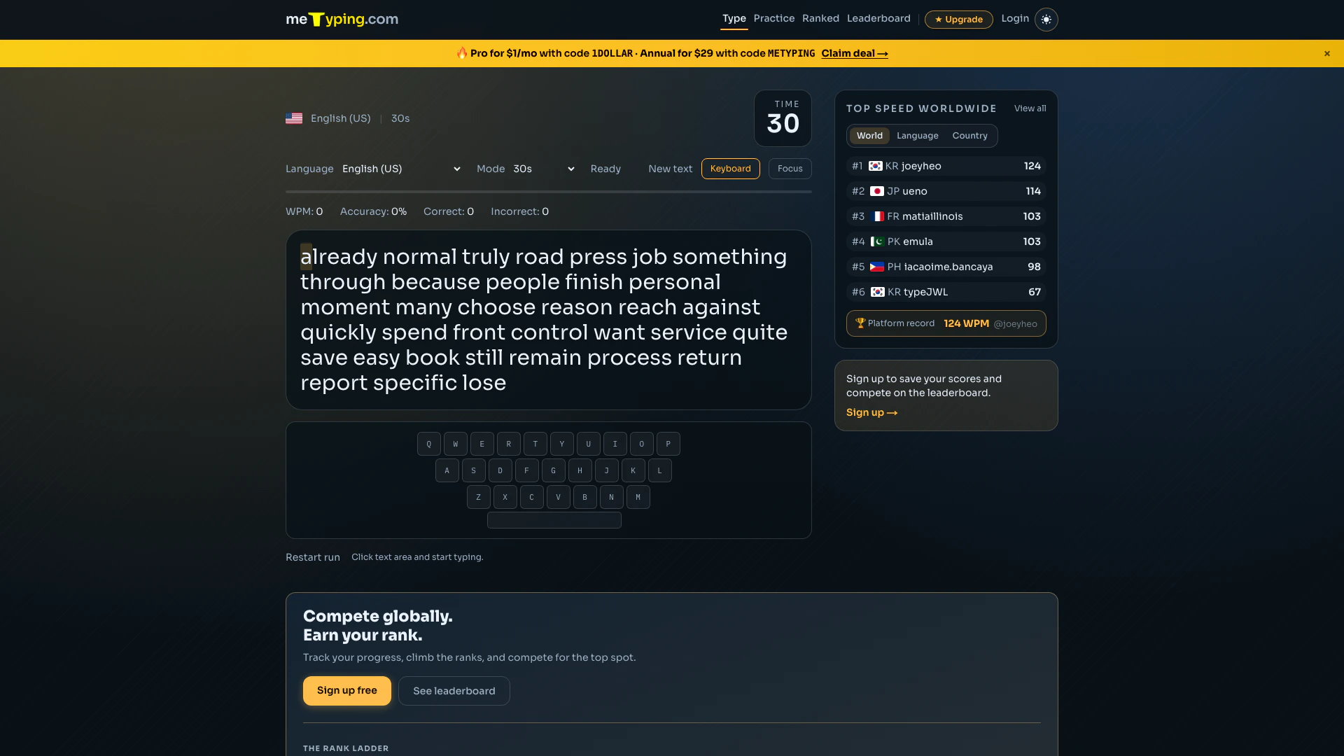 - Select your preferred language and typing mode (15s, 30s, 60s, etc.).