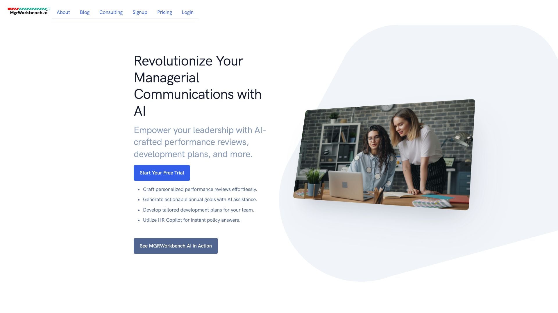 MgrWorkbench.AI helps you craft personalized performance reviews, generate actionable annual goals, develop tailored development plans, and utilize HR Copilot for instant policy answers.