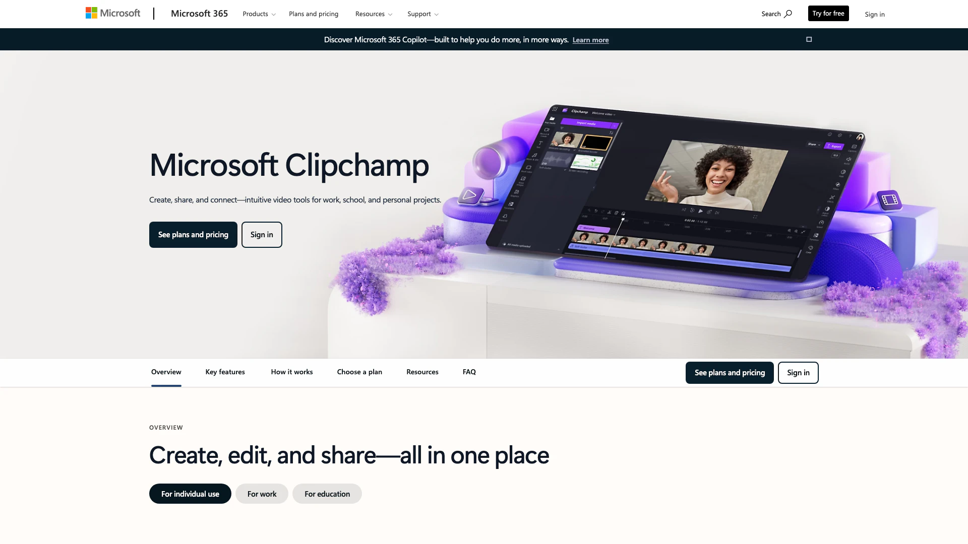 For 1 person. Unlimited watermark-free exports. Up to 1080p (HD) export resolution. Editing tools including trim, crop, and speed control. Free filters, effects, and stock media including audio, video, graphics, and stickers. Image background removal.