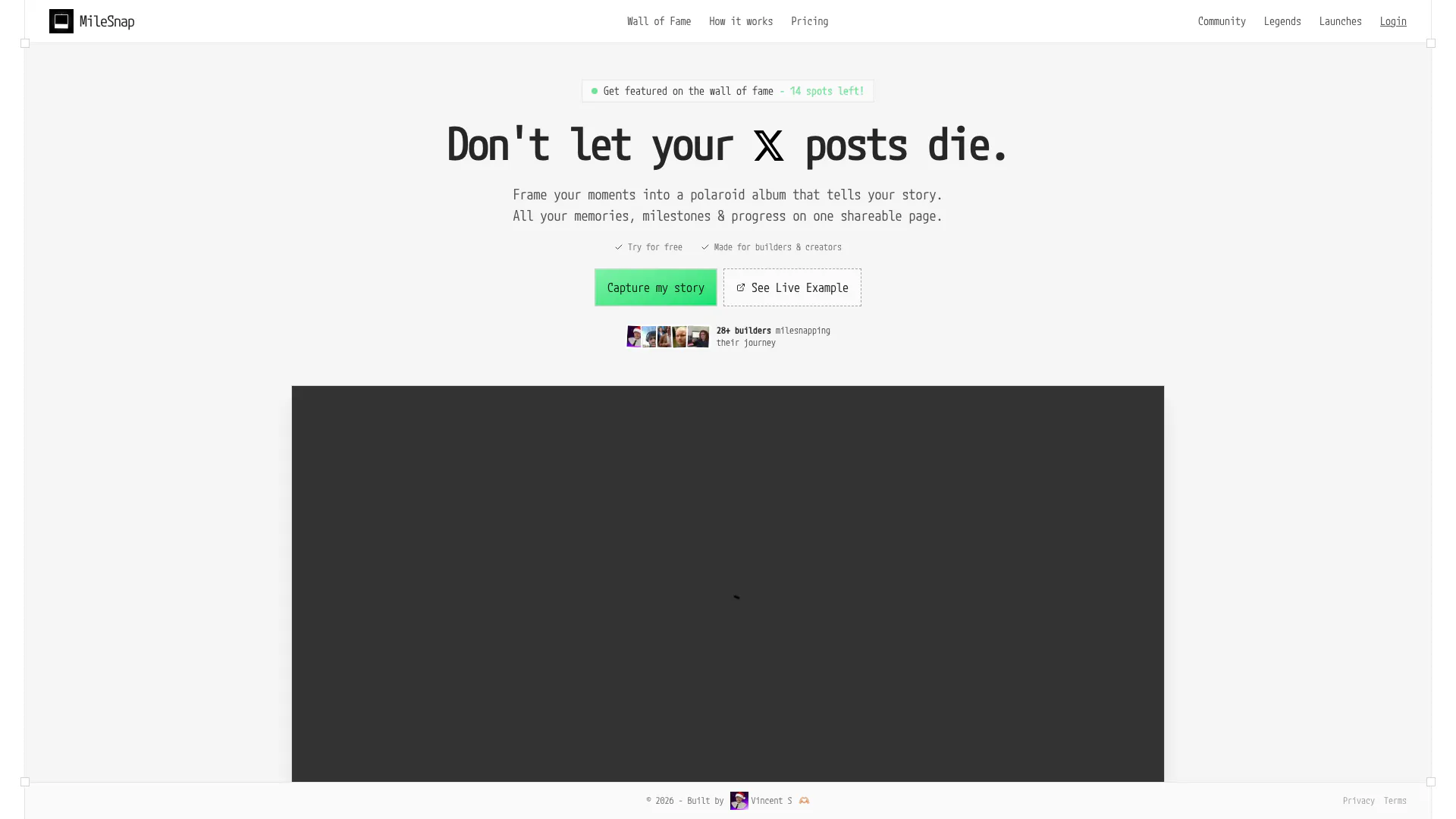 Milesnap is an innovative digital tool designed to transform your X posts into a visually appealing polaroid album. It allows users to capture and preserve their milestones and progress in a beautifully organized, shareable timeline. Instead of letting your social media posts fade away, Milesnap helps you keep your story alive by compiling all your memories on a single page, making it easy to reflect on your journey and share it with others.