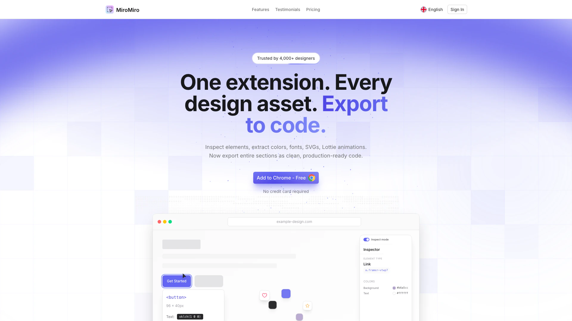 MiroMiro is a powerful Chrome extension designed for designers and developers to inspect any website element and export it to code. It allows users to extract essential design assets such as CSS, colors, fonts, SVGs, Lottie animations, and even entire sections of a webpage. Trusted by over 4,000 designers, MiroMiro streamlines the design process by providing clean, production-ready code, eliminating the need to manually recreate elements from scratch. This tool is ideal for anyone looking to enhance their workflow by easily accessing and exporting design assets directly from any website.