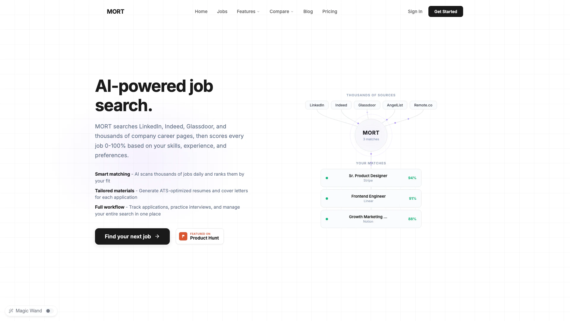 - AI Job Matching: MORT's AI scans thousands of job listings daily, scoring each job 0-100% based on user skills and preferences, ensuring relevant job matches.