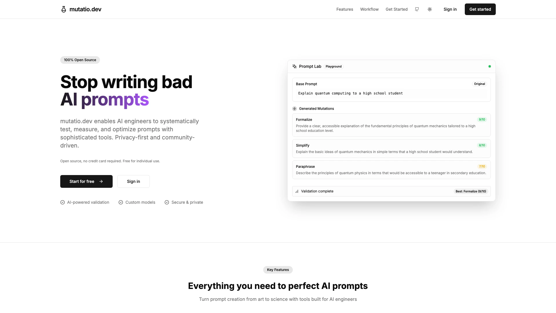 - AI-Powered Validation: Utilize sophisticated metrics and AI analysis to evaluate and compare prompt mutations, ensuring optimal performance.