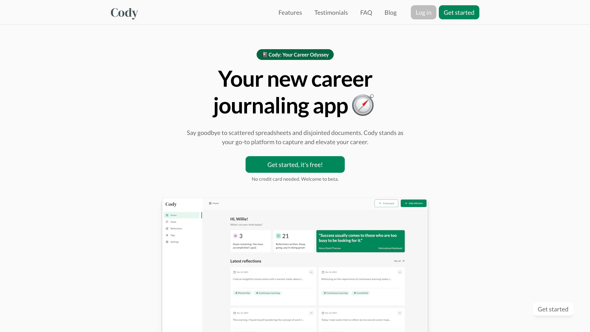 Cody is a personal career journaling app designed to help users capture their achievements, learn from challenges, and gain insights from their reflections.