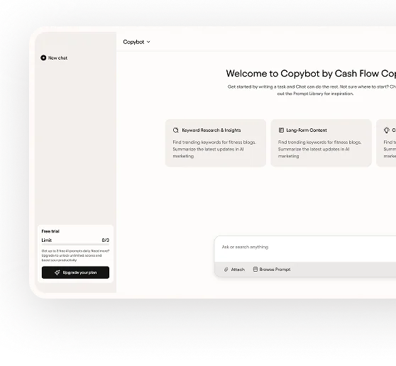 Try Copybot. Stay on Free Plan. Includes 5 prompt generations per day, 1 AI agent generation, write, edit, and create content, chat on web, iOS, and Android, analyze text and images.