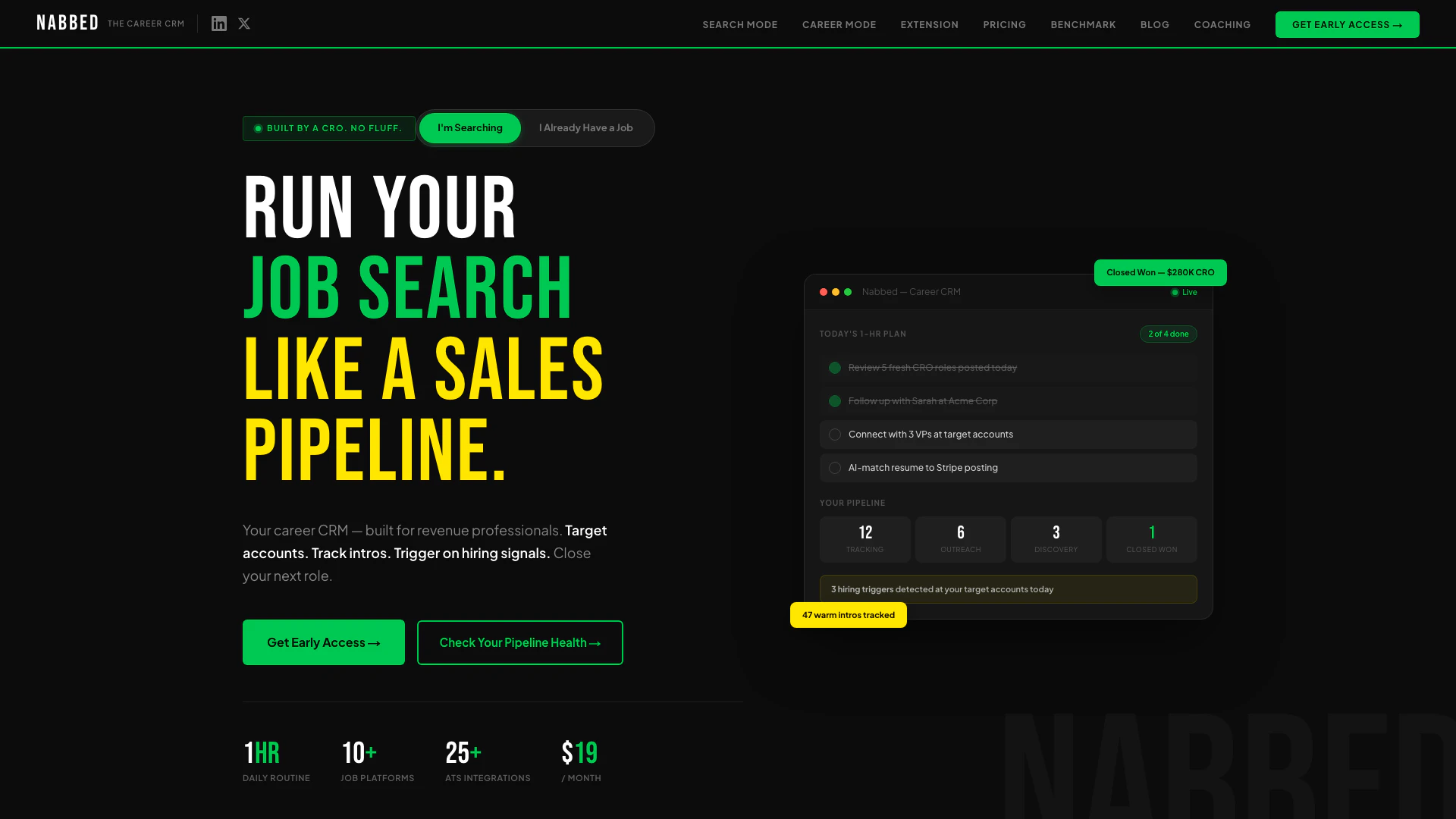 - Comprehensive Career Management: Nabbed offers a complete Career CRM designed for revenue professionals, allowing users to manage their job search like a sales pipeline.