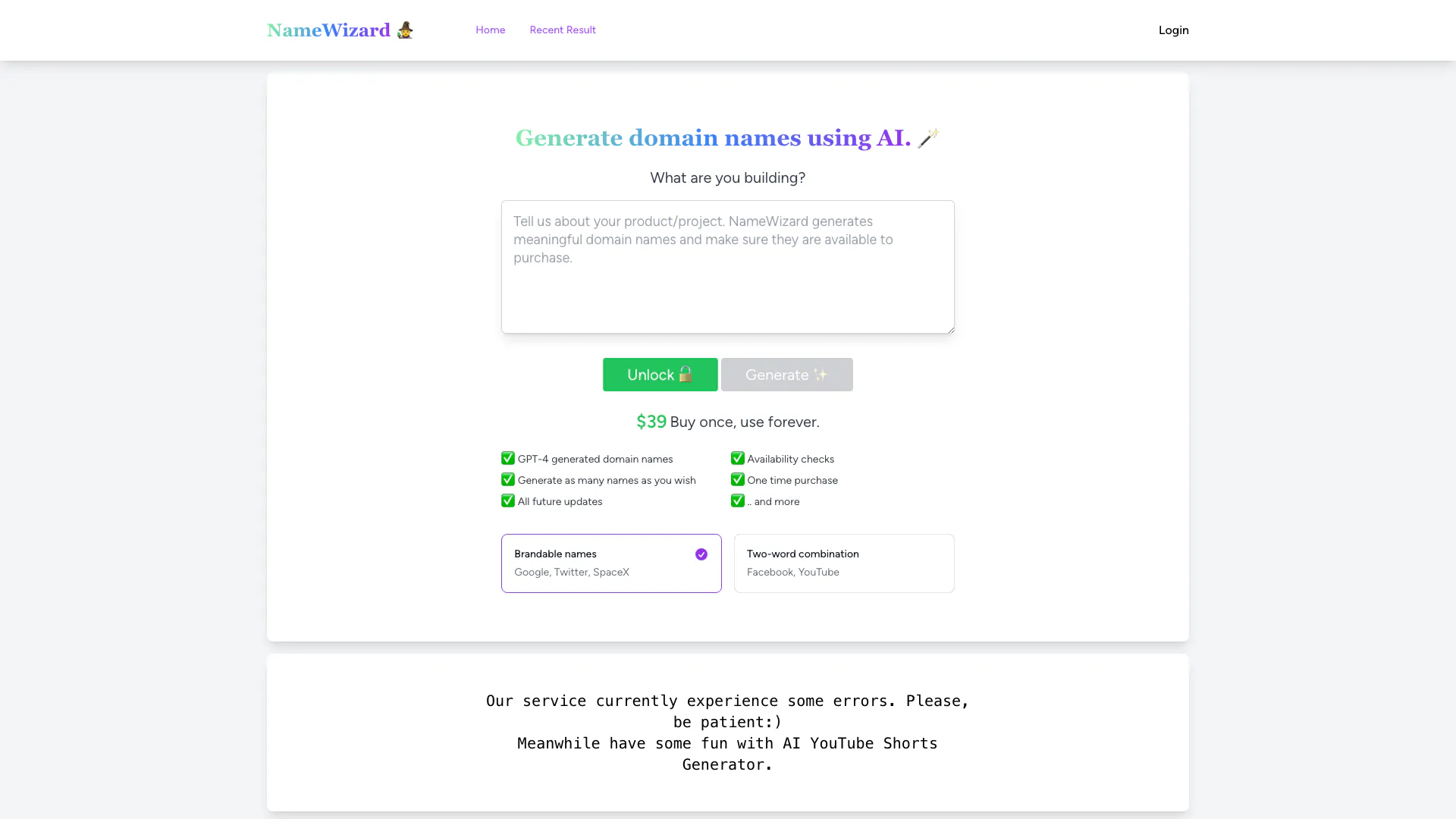 To use Namewizard, visit their website, input what you are building, and click 'Generate'. You can purchase the service for a one-time fee and generate as many domain names as you wish.