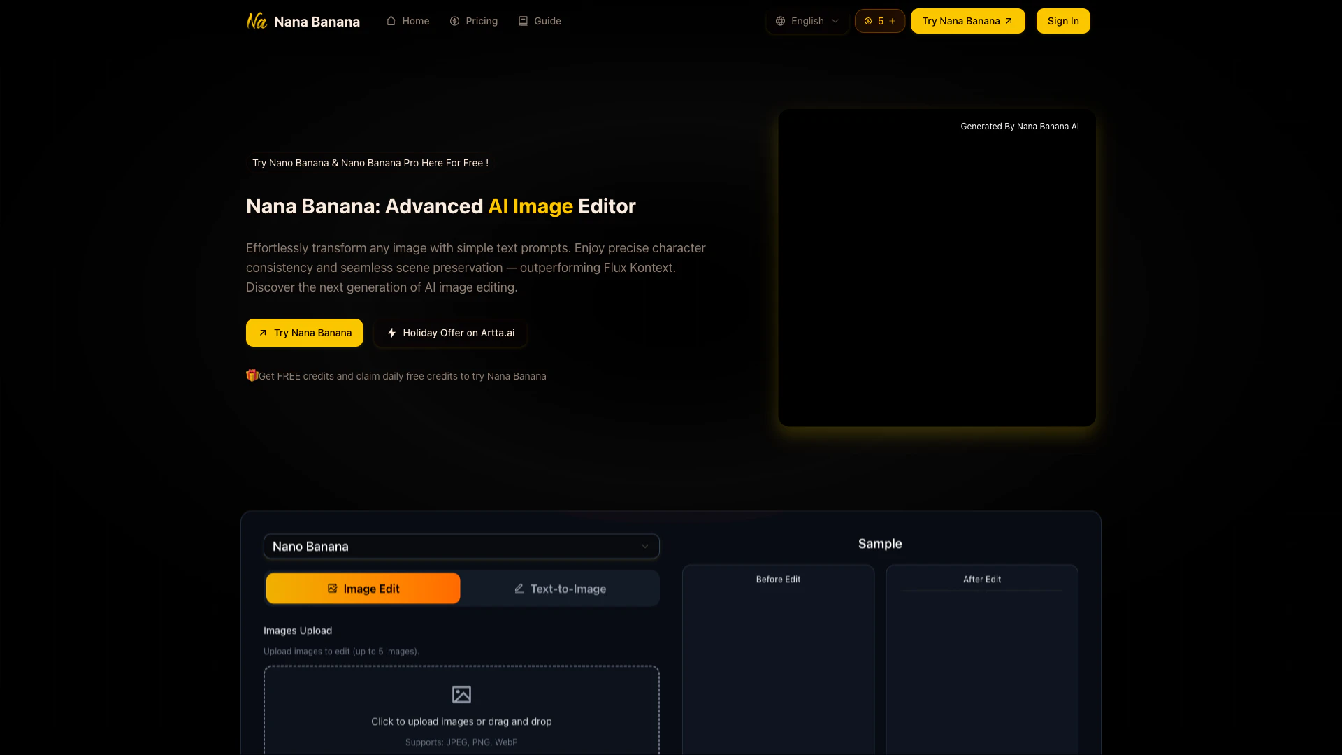 Nana Banana is an advanced AI-powered image generator and editor that enables users to create stunning AI images through intelligent image processing technology. With its sophisticated natural language understanding capabilities, Nana Banana allows users to effortlessly transform images by simply providing text prompts. It stands out in the market for its exceptional character consistency and seamless scene preservation, making it a powerful tool for content creators and marketers alike.