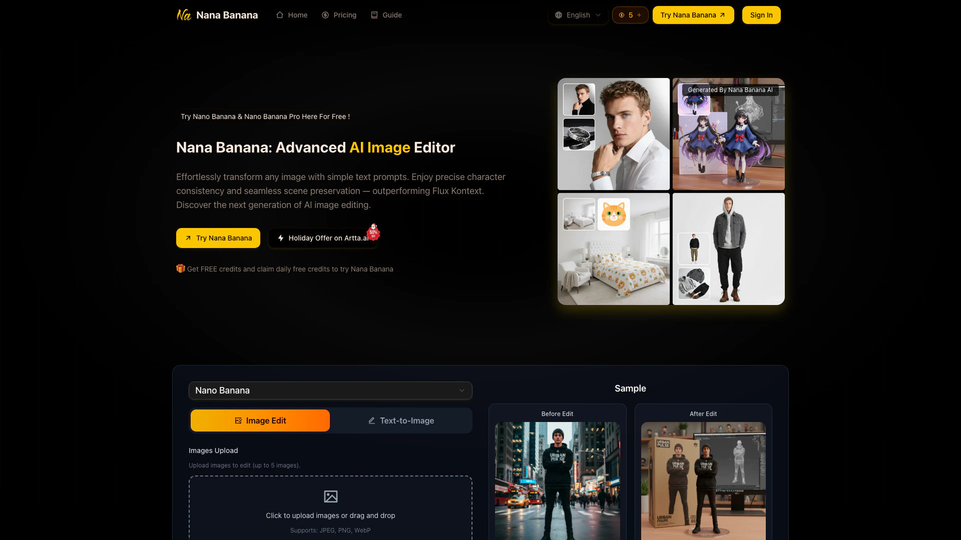 Nanaimageai, also known as Nana Banana, is an advanced AI-powered[1] image generator[2] and editor that allows users to create stunning images through intelligent image processing technology. It leverages sophisticated natural language understanding[3] to transform text prompts into visually captivating images, ensuring character consistency and seamless scene preservation. This innovative tool is designed for creators seeking high-quality visuals for various applications, from marketing to personal projects, making it a leading choice in the AI image generation landscape.