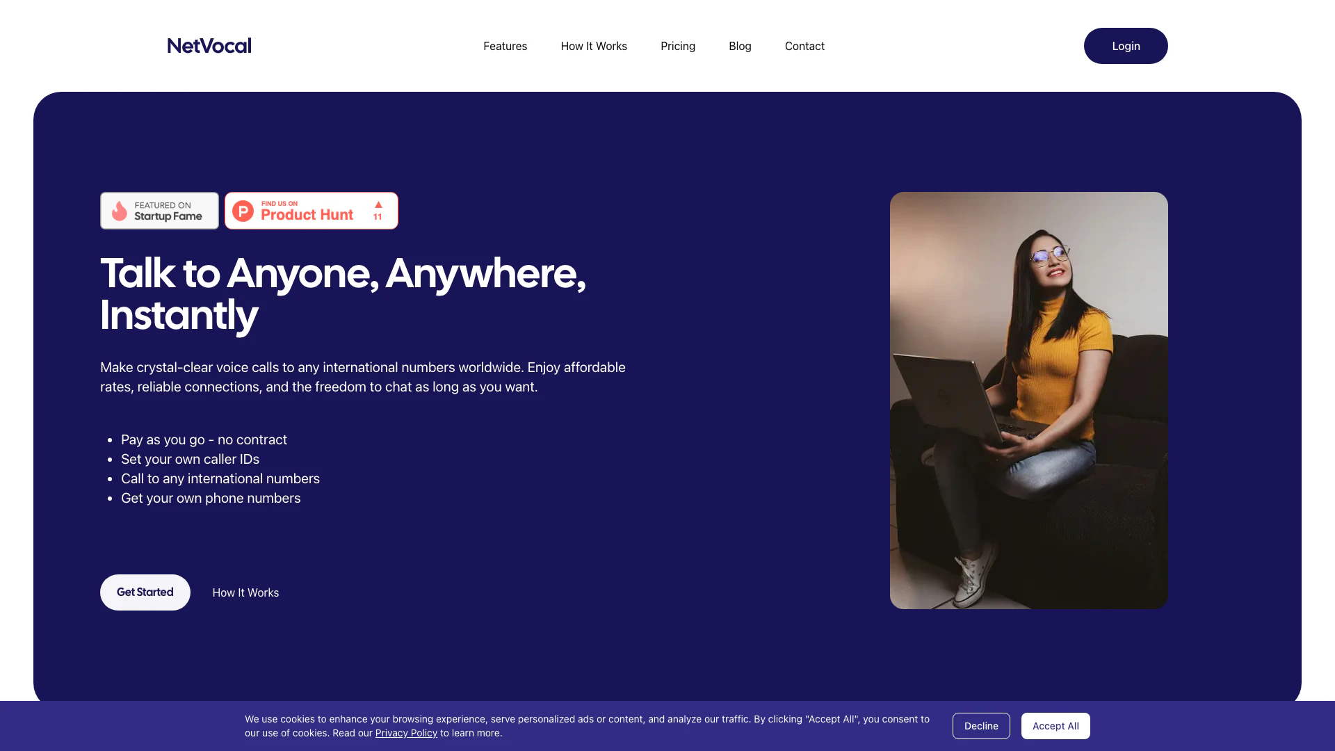 Netvocal is an innovative voice calling[1] service that allows users to make crystal-clear international voice calls to any number worldwide. With a focus on affordability and reliability, Netvocal provides a flexible, pay-as-you-go model without the need for long-term contracts. Users can personalize their calling experience by setting custom caller ID[3]s and can also acquire their own phone numbers. Designed to cater to both personal and business communication needs, Netvocal stands out as a superior alternative to traditional calling services like Skype, offering better call quality and lower rates.