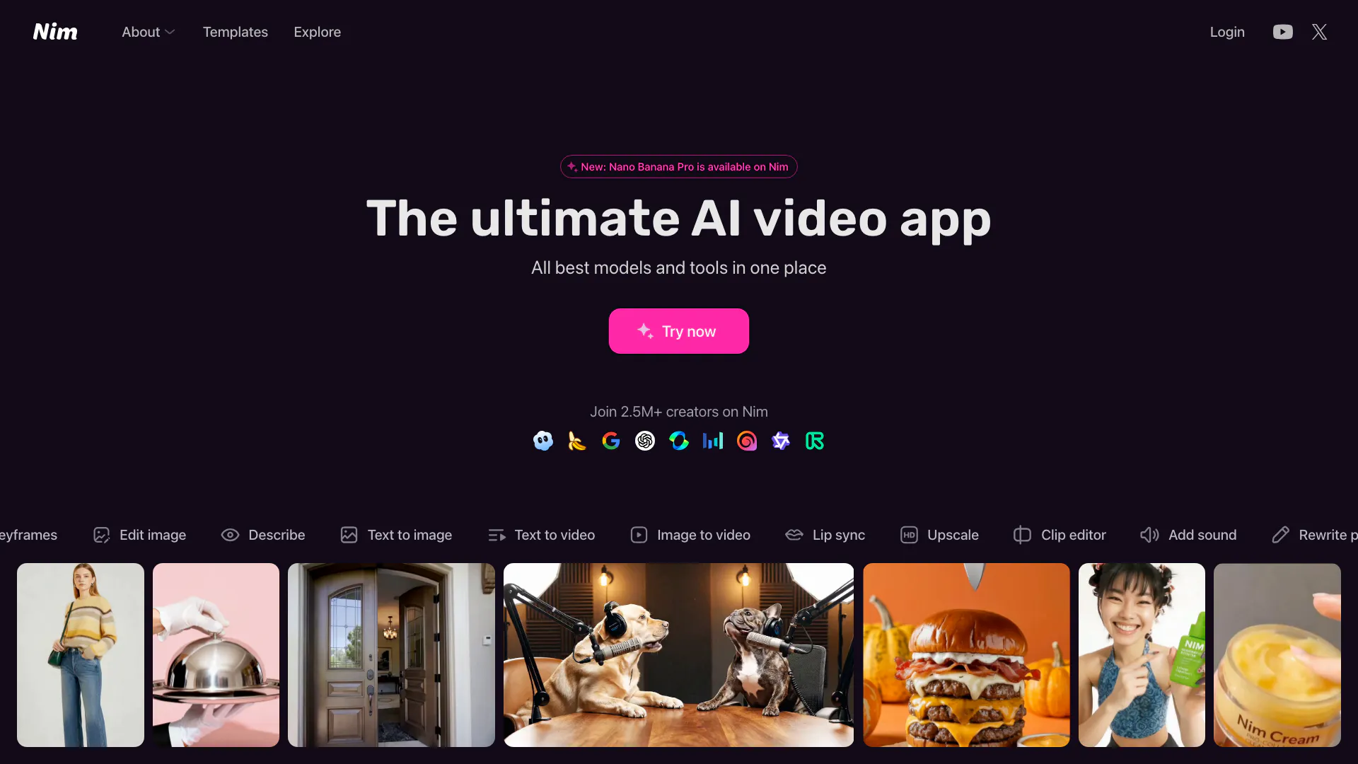 Nim is the ultimate AI video app that allows users to generate videos using state-of-the-art models and a variety of templates. It offers features such as text-to-image, image-to-video, lip sync, and upscaling, making it a comprehensive tool for creators looking to enhance their video production process.