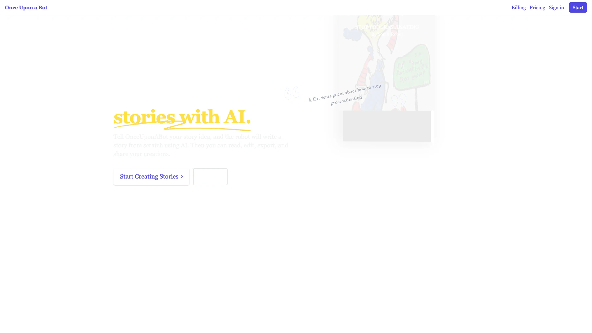 Once Upon A Bot is an innovative AI tool designed to create children's stories. By simply providing a story idea, users can leverage advanced artificial intelligence to generate unique and engaging tales from scratch. The platform utilizes state-of-the-art AI models, including GPT-3 and Stable Diffusion, enabling users to create, edit, and share their stories seamlessly. With a focus on creativity and fun, Once Upon A Bot is ideal for parents, educators, and anyone interested in storytelling.
