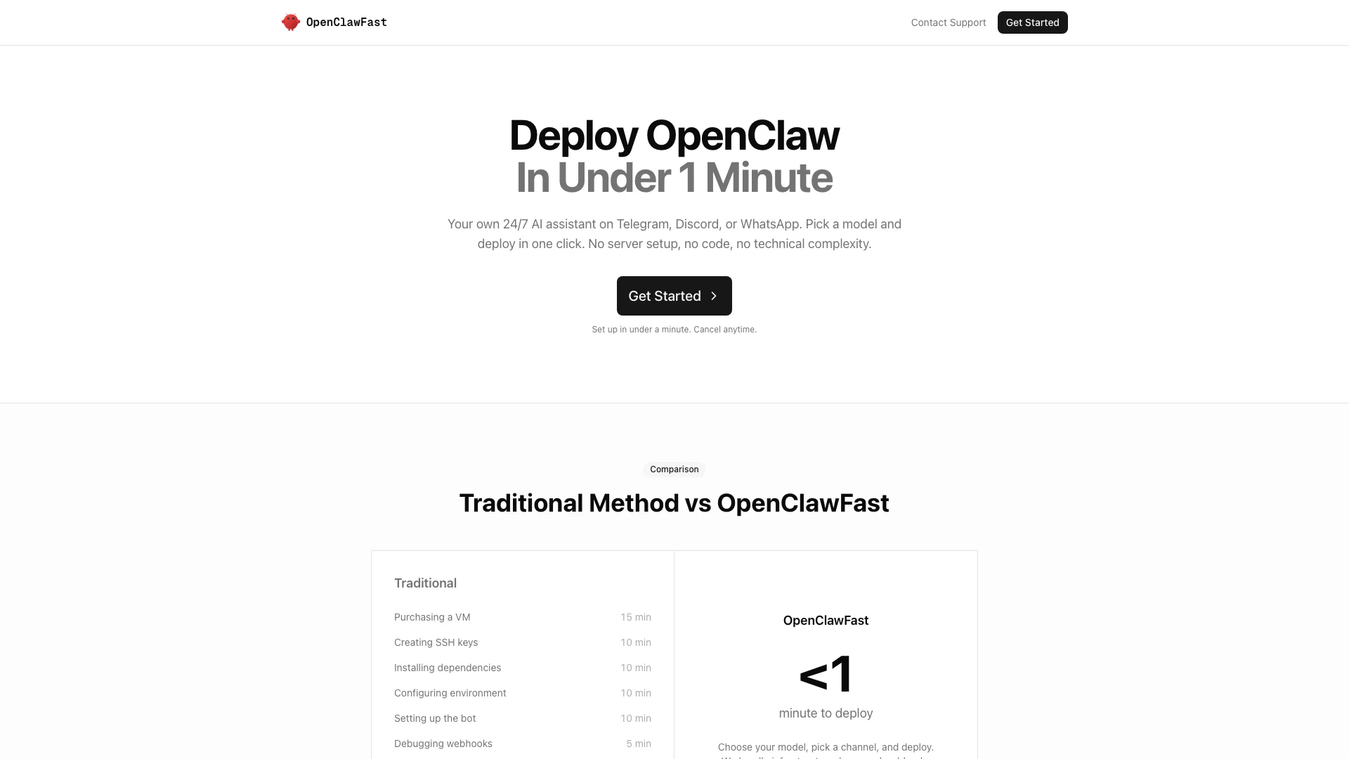 OpenClawFast is a cutting-edge AI assistant[1] deployment tool that allows users to run OpenClaw 24/7 on popular messaging platforms such as Telegram[3], Discord[4], WhatsApp[5], and Slack. This tool eliminates the need for complex setups like VPS, Docker, or SSH, enabling users to deploy their AI assistant instantly with just a click. Designed for ease of use, OpenClawFast provides a streamlined experience, allowing users to select their desired AI model and channel, and deploy it in under a minute, making it accessible for both technical and non-technical users.