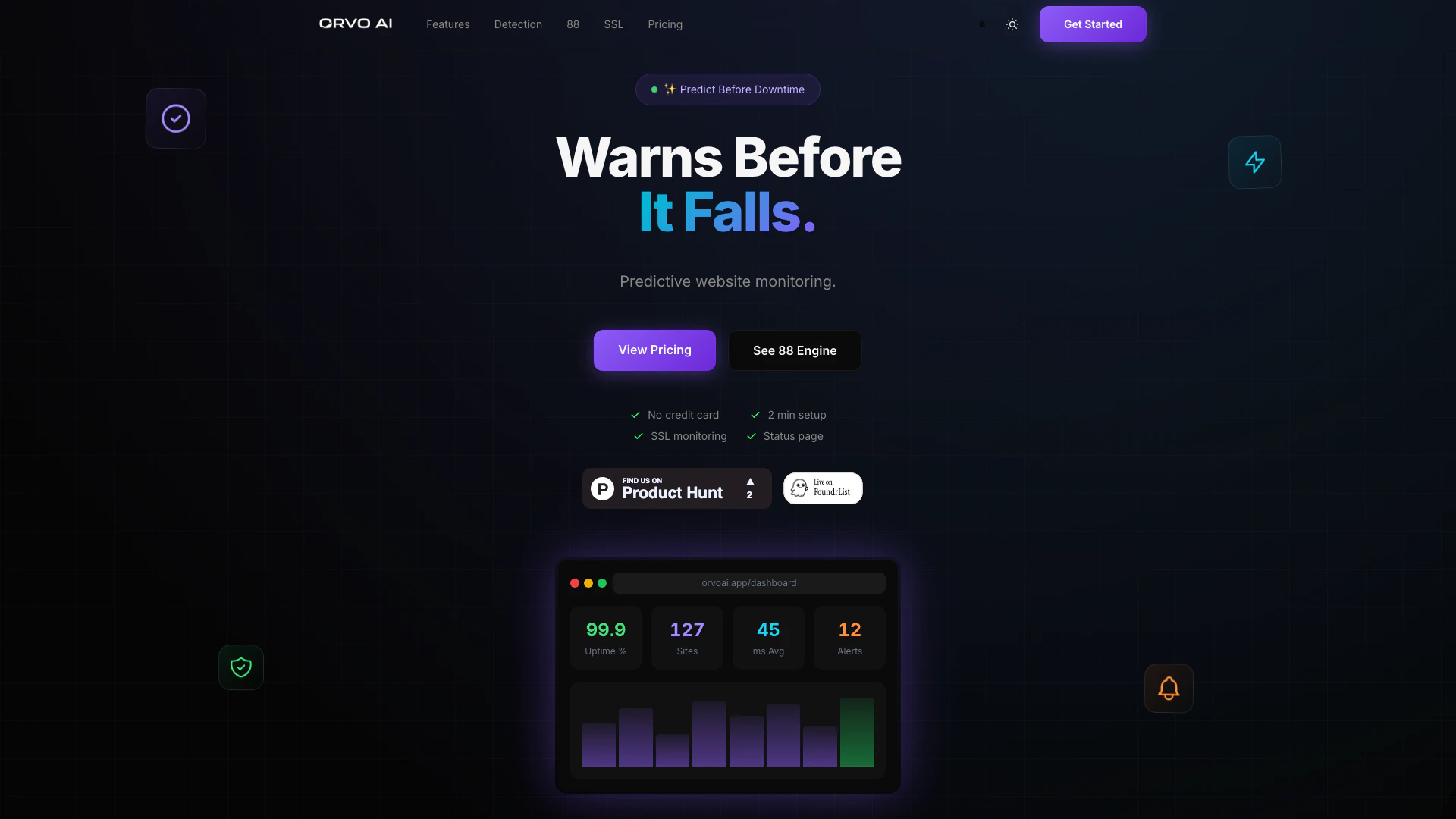 Orvoai is an advanced monitoring tool designed to predict instability before it leads to downtime. Utilizing its proprietary 88 Engine[2], Orvoai offers stability forecasting[1], SSL monitoring[3], real-time alerts, and explainable Stability Risk Scores. This ensures that users can proactively address potential issues, enhancing their website's reliability and performance. By providing early warnings about system degradation, Orvoai empowers businesses to maintain optimal uptime and user experience.