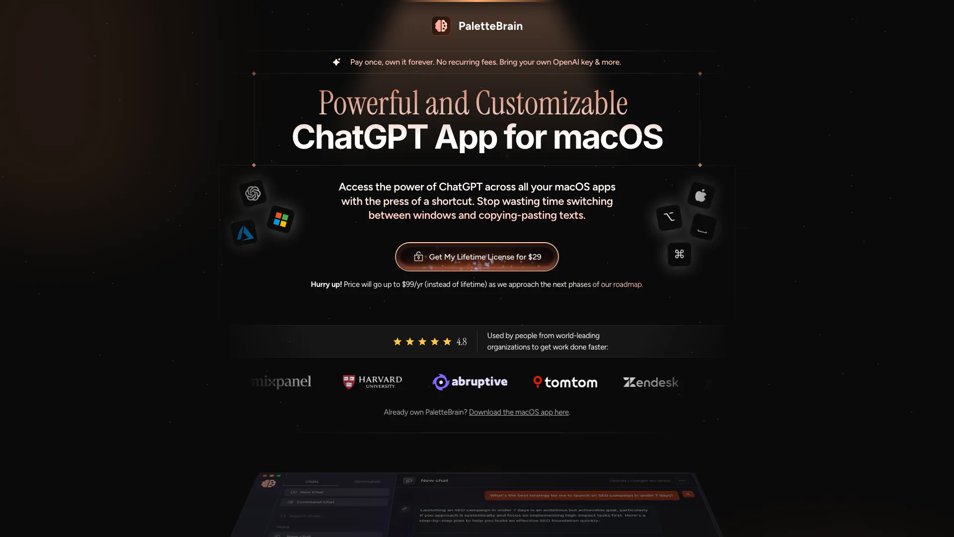 PaletteBrain allows you to access ChatGPT across all your macOS apps with the press of a shortcut, enhancing your productivity by enabling custom commands and automating tasks.