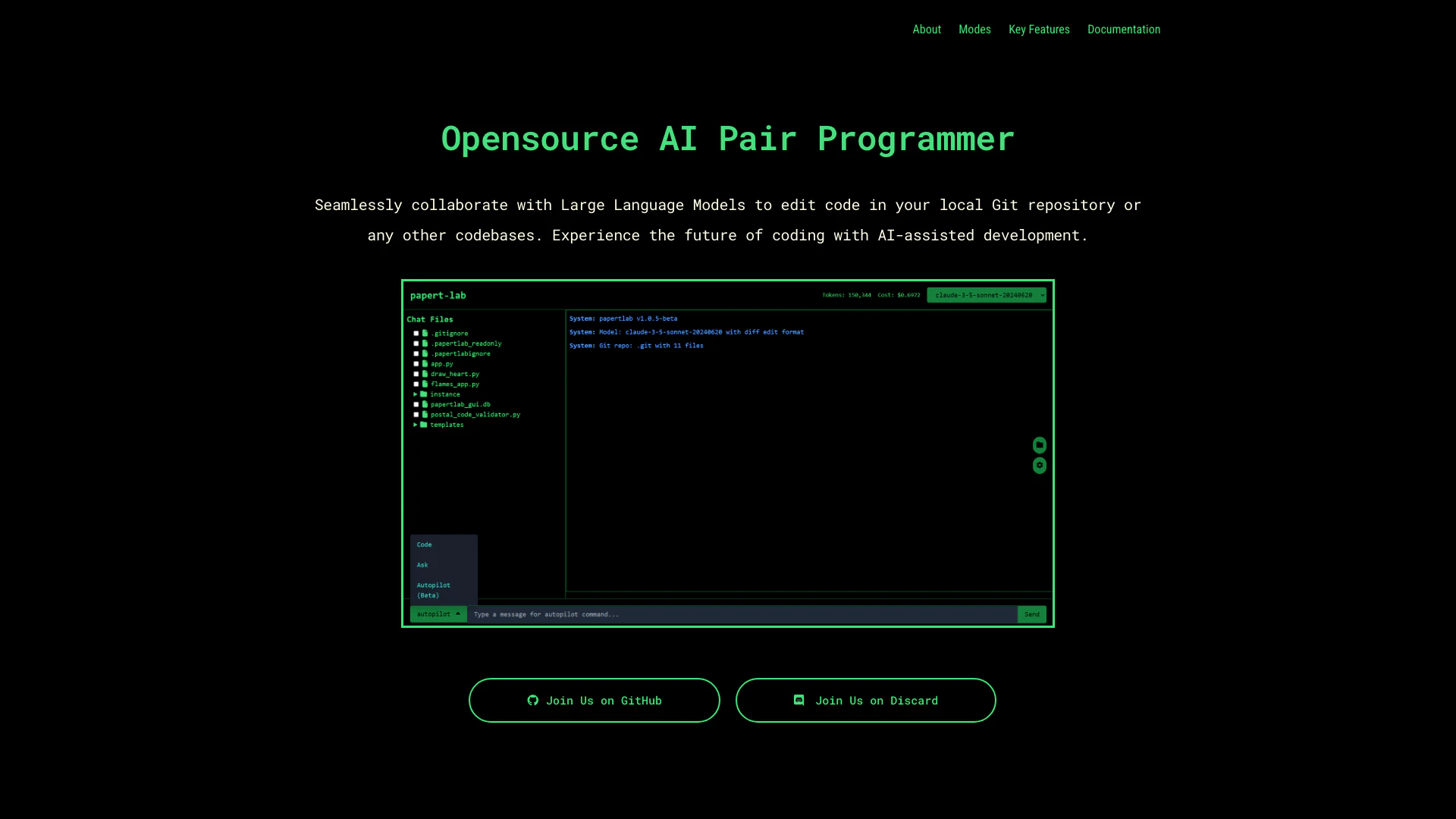 Papert is an open-source AI pair programmer[1] designed to enhance coding efficiency by collaborating seamlessly with large language models. It allows developers to edit code directly in their local Git repositories or any other codebases. By leveraging AI-assisted development, Papert empowers programmers to receive real-time suggestions[2], debugging assistance[3], and best practices advice, thereby revolutionizing the coding experience.