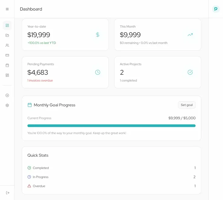 - Track & Get Paid: Monitor incoming payments on your real-time dashboard. Automatic reminders ensure clients stay on schedule while you concentrate on your work.