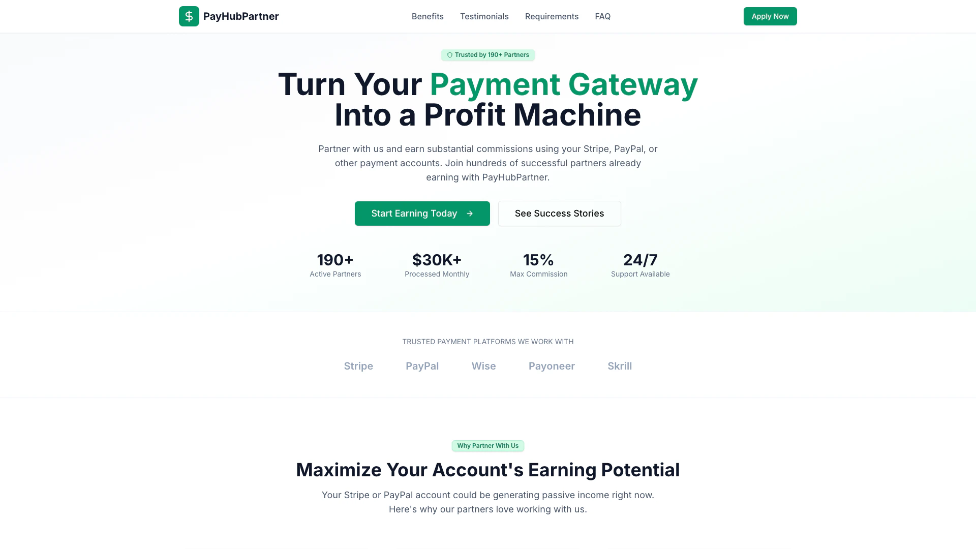 PayHubPartner is an innovative platform designed to help individuals turn their payment gateway accounts, such as Stripe and PayPal, into a source of passive income. By partnering with PayHubPartner, users can earn up to 15% commission on every transaction processed through their accounts. This platform not only allows partners to maximize their earning potential but also provides a transparent and secure environment for managing their earnings. With a dedicated support team available 24/7, PayHubPartner aims to empower users to generate substantial passive income effortlessly.