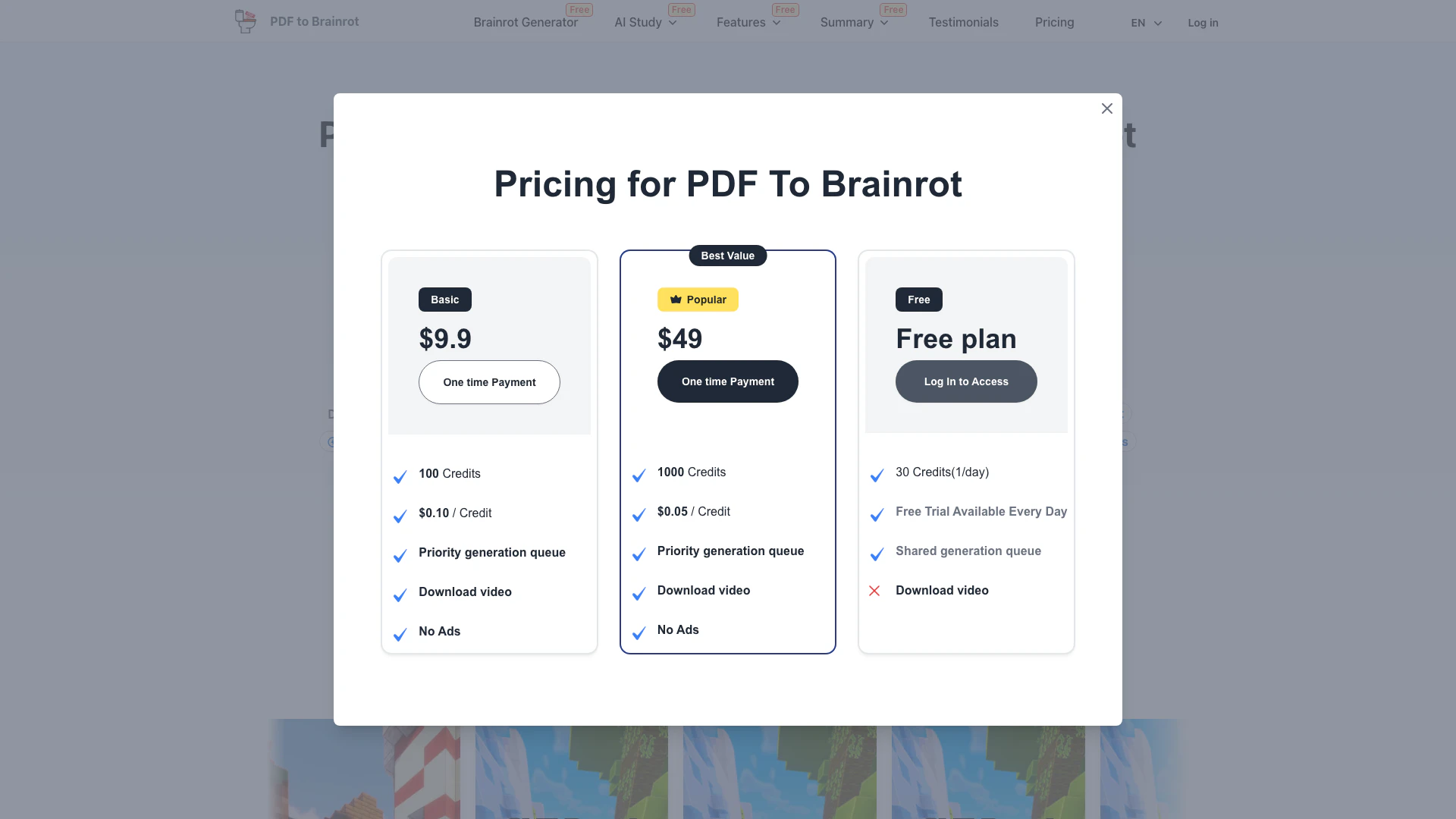 For the latest pricing, please visit this link: https://pdftobrainrot.org/pricing