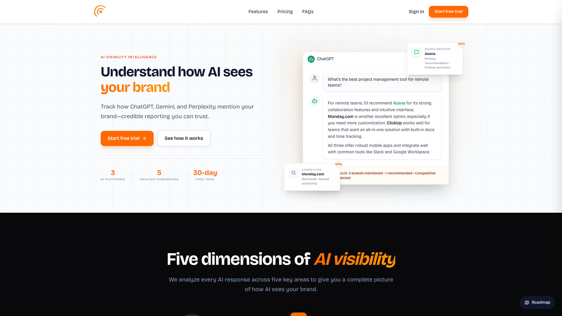 - Comprehensive AI Monitoring: Track every mention of your brand across various AI platforms, including ChatGPT and Perplexity.