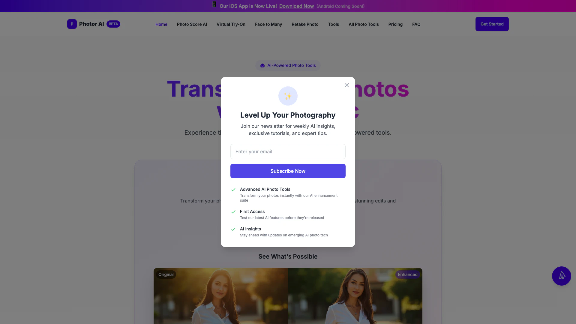 - AI-Powered Photo Enhancement: Utilizes advanced AI technology to enhance photos quickly and effectively, providing professional-grade results.