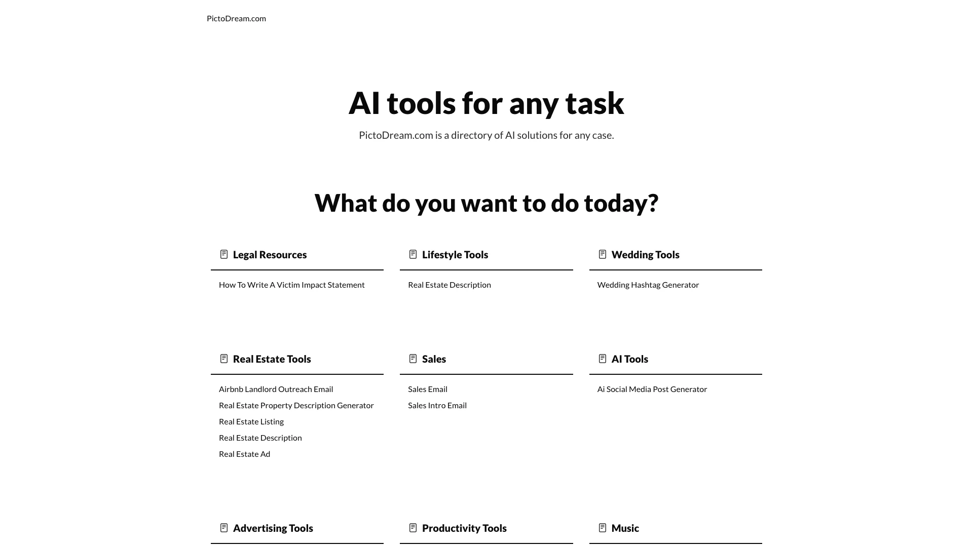 Pictodream is an innovative AI tool designed to streamline content creation and answer questions more efficiently. It serves as a comprehensive directory of AI solutions tailored for various tasks, allowing users to generate creative content quickly and intelligently. Whether you need assistance in writing, generating ideas, or formulating responses, Pictodream simplifies the process, making it a valuable resource for individuals and businesses alike.