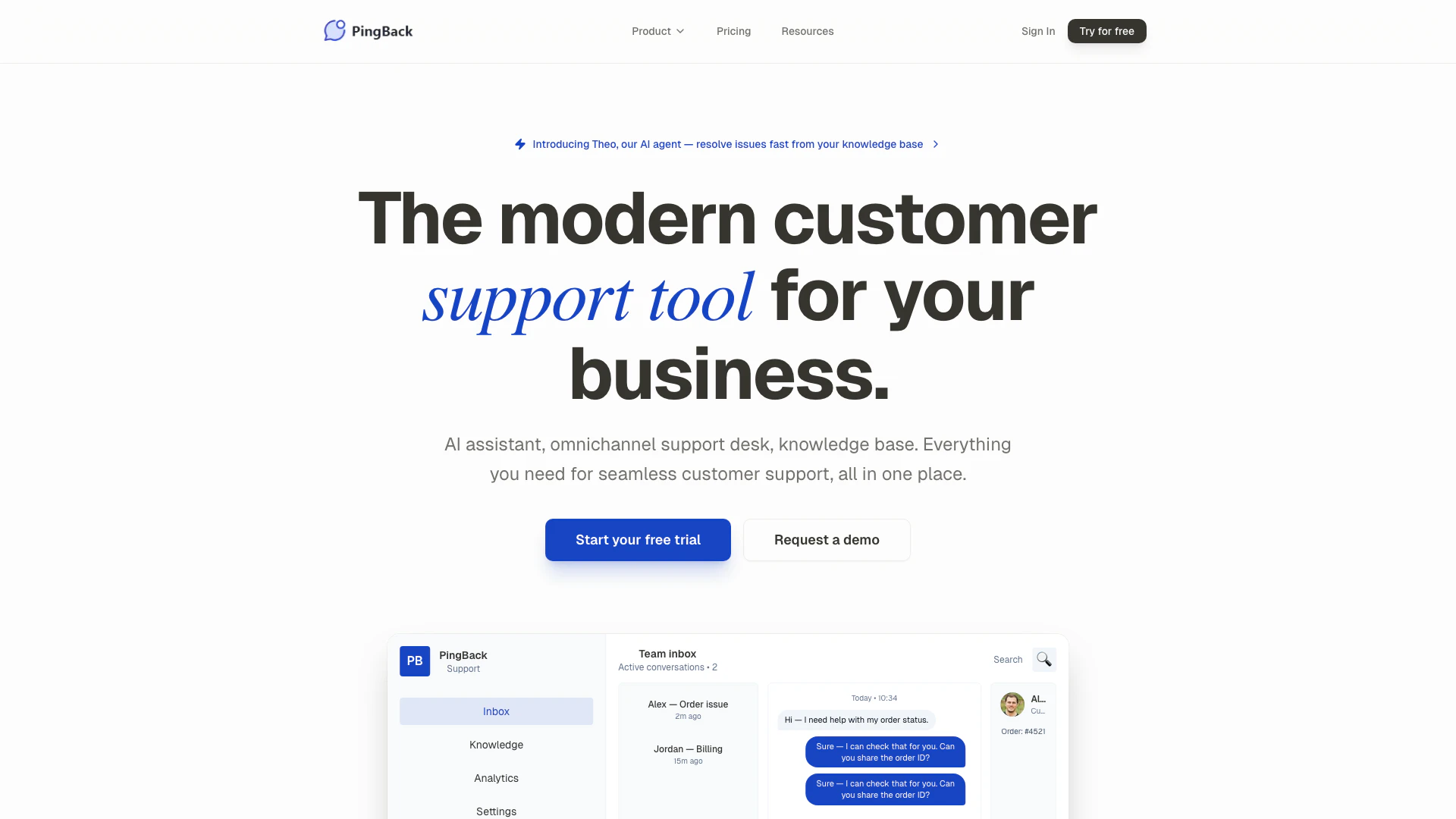 PingBack is a modern omni-channel customer support platform that enables businesses to manage customer interactions seamlessly across various channels including live chat, email, WhatsApp, Telegram, Instagram, and Facebook. It provides a centralized inbox for all conversations, allowing support teams to respond to customer inquiries quickly and efficiently. With its AI-powered assistant, Theo, PingBack enhances the customer support experience by providing instant answers to common questions, helping teams focus on more complex issues. The platform is designed for businesses of all sizes, aiming to streamline communication and improve customer satisfaction.