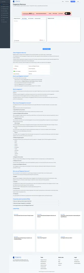 Plagiarism Remover offers several key features, including: - Multiple Removal Modes: Choose from four modes tailored to different needs: Plagiarism Remover, Word Changer, Formal, and Shorten. - File Upload: Users can upload documents directly from their devices for processing. - Language Support: The tool supports over 15 languages, catering to a global audience. - Plagiarism-Free Content: Utilizes AI technology to ensure content uniqueness while maintaining the original context. - Word Count Display: Automatically counts words in the provided text, saving time for users. - Human-Level Plagiarism Removal: Ensures that rewritten content flows naturally and reads well.