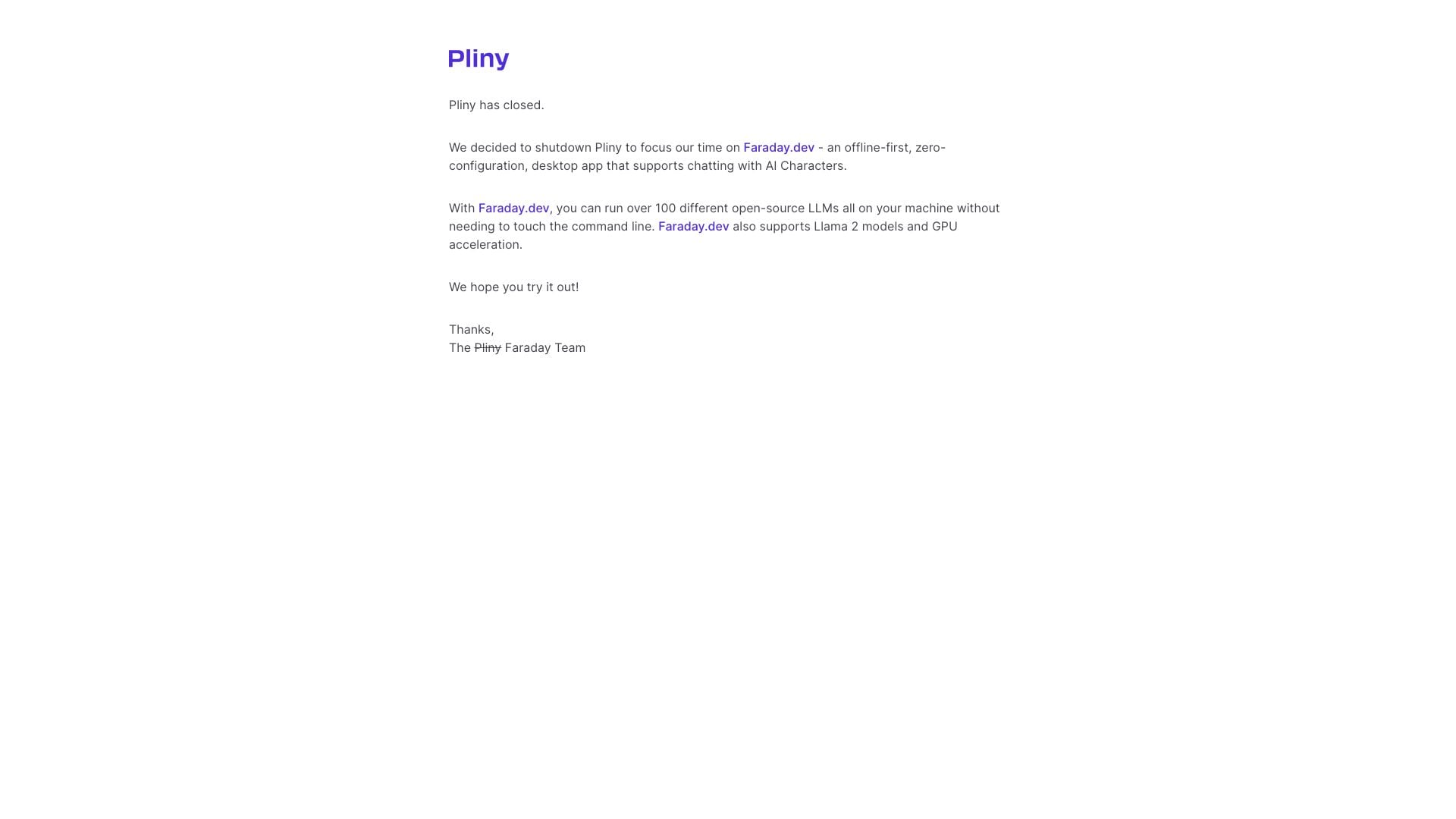 - Focus on New Product: Pliny has been shut down to allow the team to focus on Faraday.dev, which offers more advanced features.