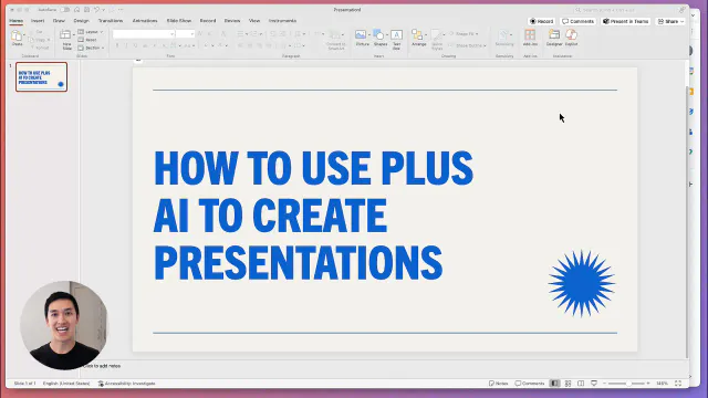 To use Plus AI, install it from the Google Workspace Marketplace, open a Google Slides presentation, then navigate to Extensions > Plus AI for Google Slides™. Select 'New presentation with Plus AI' and enter your prompt or text to generate a presentation.