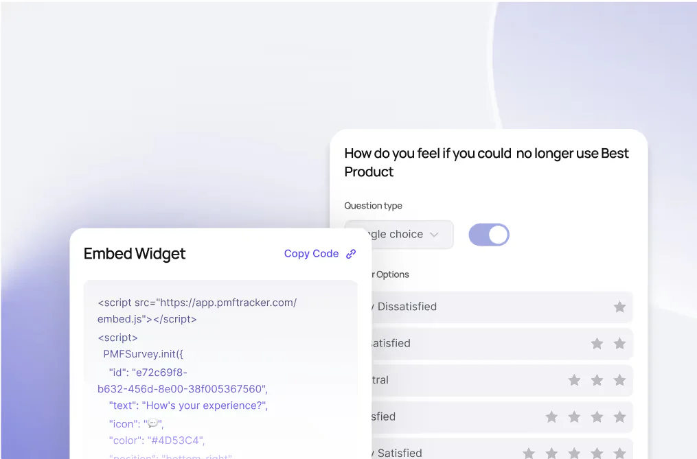 - Set Up Your Survey: Embed the Pmftracker widget in your product and create a PMF survey to gather user feedback.