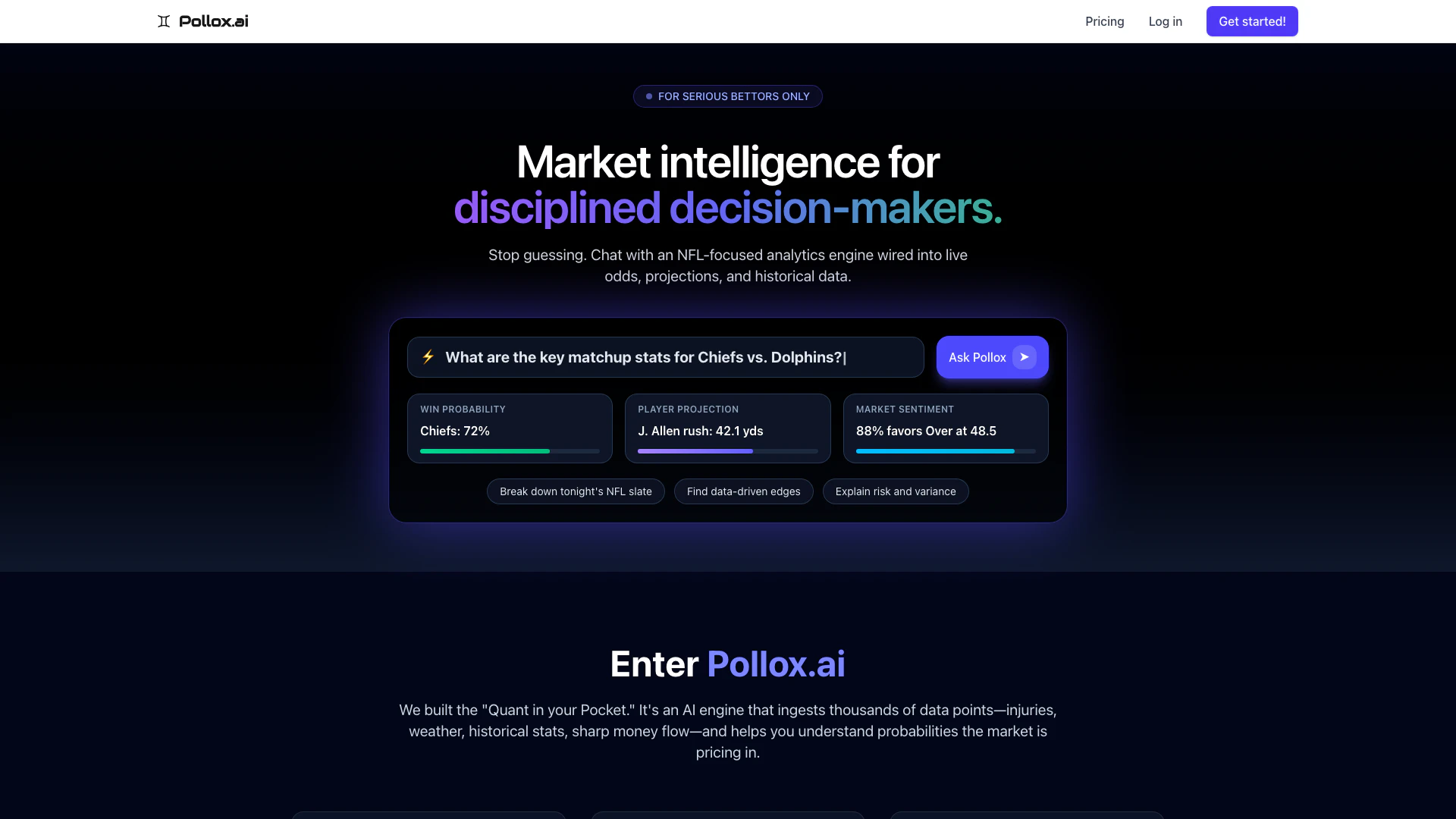 Polloxai is ideal for sports enthusiasts and bettors who want to enhance their decision-making process with data-driven insights. It caters to both casual fans looking to make informed bets and professional bettors ('sharps') who rely on statistics rather than emotions. The platform is particularly beneficial for those who are frustrated with traditional betting methods and seek a more analytical approach to sports betting, especially in the NFL.
